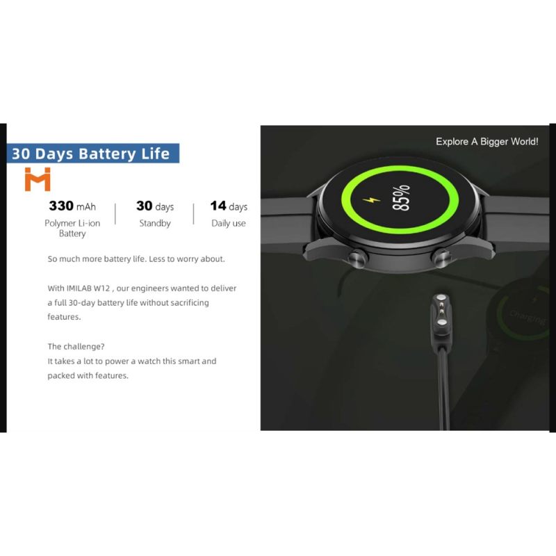 ساعت هوشمند شیائومی مدل Imilab W12 با یک باطری 330 میلی آمپر ساعتی و صفحه نمایش 1.32 اینچی است که دارای سنسور اندازه گیری میزان اکسیژن خون است و با استاندارد ضدآب IP68 گواهی شده است.