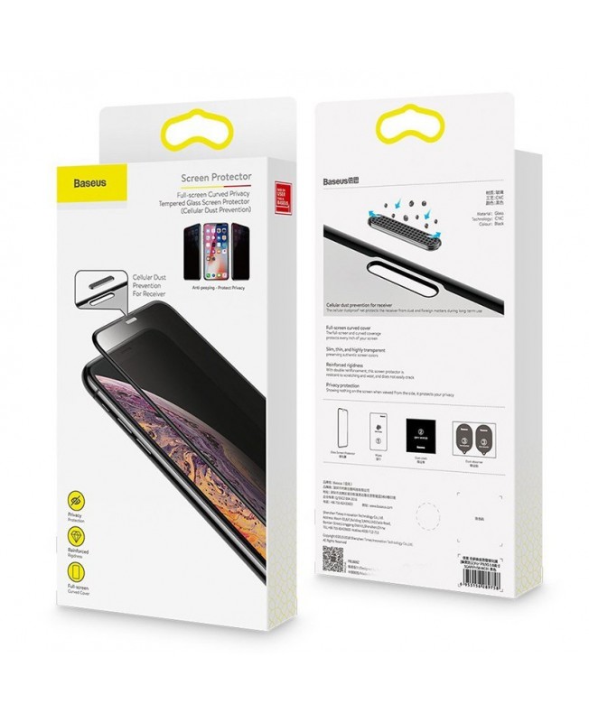 این مدل گلس که توسط کمپانی باسئوس تولید شده است Privacy بوده و هنگام استفاده از گوشی ، اگر از طرفین به گوشی نگاه کنید چیزی دیده نمی شود و صفحه نمایش گوشی خاموش به نظر می رسد که این قابلیت در مکان های عمومی مانند مترو ها و اتوبوس می تواند کارآمد باشد. اگر گوشی کاربران در کیف کنار وسایل تیز نظیر دسته کلید قرار بگیرد آسیبی به نمایشگر آن وارد نخواهد شد و کاربران می توانند از سلامت صفحه نمایش گوشی خود اطمینان خاطر پیدا کنند. گلس حریم شخصی گوشی اپل IPhone X | IPhone XS | IPhone 11 Pro از برش های دقیقی برخوردار بوده و به خوبی روی صفحه نمایش گوشی موبایل شما قرار می گیرد. همچنین یکی دیگر از ویژگی های این گلس ، ضد گرد و غبار بودن قسمت اسپیکر آن میباشد.