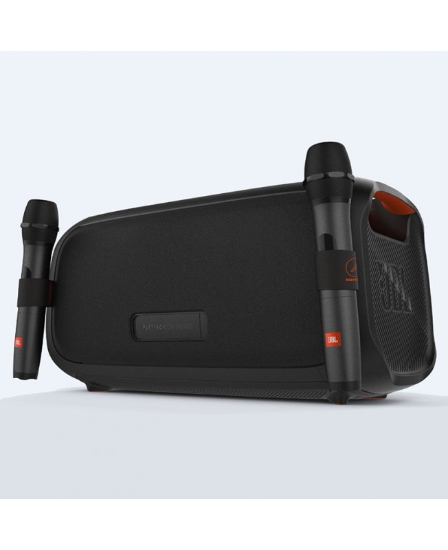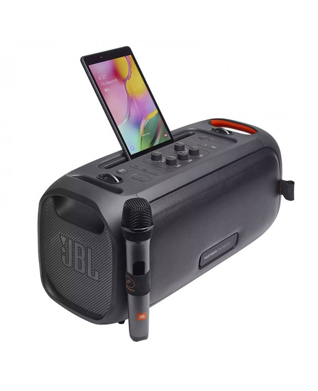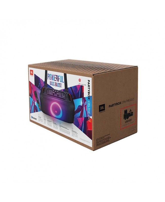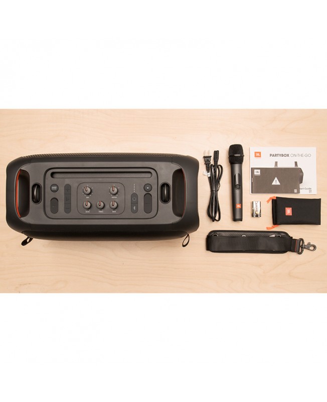 زمانی که اسپیکر JBL Party Box On The Go را جعبه گشایی کنید ، علاوه بر خود اسپیکر ، یک یا دو عدد میکروفون بی سیم ( سفارش های آسیا به جز کشور های هند و ژاپن دارای دو میکروفون هستند ) ، بند رو دوشی اسپیکر ، کابل های شارژ و کاتالوگ راهنمای محصول درون جعبه قرار دارند. بوسیله میکروفون بی سیم جی بی ال پارتی باکس On The Go می توانید هم زمان با موسیقی بخوانید و از آن لذت ببرید. همچنین یک درگاه برای اتصال گیتار بصورت سیمی روی اسپیکر قرار دارد. به لطف باتری 2500 میلی آمپر ساعتی Party Box On The Go با یک بار شارژ کامل می توانید تا 6 ساعت از آن استفاده نمایید ؛ البته این مقدار به میزان بلندی صدای اسپیکر و روشن یا خاموش بودن رقص نور آن بستگی دارد. در آخر نیز باید بگوییم که پارتی باکس On The Go دارای استاندارد ضد پاشش آب IPX4 است و می تواند خیالتان را از استفاده در محیط های گوناگون راحت کند.