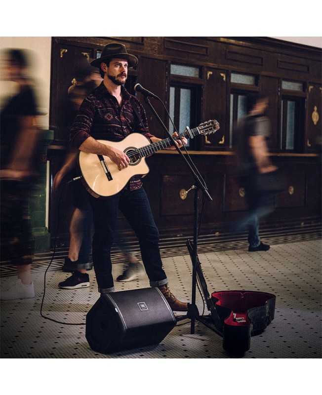 اسپیکر بلوتوثی جی بی ال JBL Pro EON One Compact که از سری Professional audio است یک تکه می باشد و یک میکسر صدا روی آن قرار دارد که مجموعا وزن آن 8 کیلوگرمی با ابعاد 291*255*399 میلی متر است. جنس بدنه JBL Pro EON One Compact از پلاستیک سخت و با طوری فلزی پوشیده شده است که بدنه ای مقاوم و با کیفیت دارد. وقتی JBL Pro EON One Compact جی بی ال را جعبه گشایی کنید علاوه بر خود اسپیکر ، باتری قابل شارژ اسپیکر ، کابل شارژ و دفترچه راهنمای محصول درون جعبه قرار دارد. توان خروجی صدای این اسپیکر قدرتمند تنها 150 وات است که صدایی بسیار بلند تر از تصور پخش میکند. اسپیکر بلوتوثی جی بی ال Pro EON One Compact دارای یک ووفر 8 اینچی با توان پخش صدا های بم تا 37.5 هرتز است که 150 وات قدرت دارد. میکسر صدای این اسپیکر نیز 4 کانال بوده و میتوانید 2 میکروفون و 1 کابل گیتار را به آن متصل نمایید. همچنین روی این میکسر یک خروجی هدفون با جک 3.5 میلی متری روی آن قرار دارد. نوع اتصال به این اسپیکر نیر بصورت بلوتوثی است و دکمه اتصال به آن نیز روی میکسر اسپیکر قرار دارد.