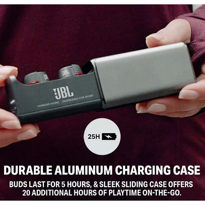 هندزفری بیسیم JBL Under Armour Flash X دارای طراحی ارگونومیک بوده و امکان قراردادن آن به صورت کاملا آسان در گوش شما را فراهم میکند. با بهرهگیری از این نوع طراحی بدون نگرانی از خارج شدن هندزفری از گوشهایتان، میتوانید به ورزش کردن یا انجام امورات روزانه خود بپردازید و از آنها لذت ببرید. اتصال به هندزفری JBL Under Armour Flash X به صورت بیسیم و از طریق بلوتوث صورت میگیرد. با استفاده از این قابلیت میتوانید به آسانی به پخش موسیقیهای مورد علاقه خود بپردازید و از آن لذت ببرید. محفظه شارژ این هندزفری از جنس آلومینیوم ساخته شده است که مقاومت خوبی دارد. این محفظهی مخصوص، دارای یک عدد پورت USB-C است که با استفاده از آن می توانید کیس را شارژ کنید. شما میتوانید با هربار شارژ کامل این محفظه، در مدت زمان 50 ساعت از آن استفاده کنید. همچنین این محفظه قابلیت شارژ کردن Under Armour Flash را به صورت کامل دارد. اگر هندزفری شما خالی از شارژ باشد، شما میتوانید دو بار، آنها را کاملا شارژ کنید و از پخش موسیقی یا مکالمه با آنها لذت ببرید. کمپانی JBL محصولات خود را به گونهای طراحی میکند تا صدای تولید شده توسط آنها، به گونهای یک نشانه از کیفیت و قدرت این شرکت باشد. این هندزفری نیز دارای تکنولوژی های متعددی است که صدای باکیفیت و مخصوص JBL را برای شما به ارمغان میآورد.