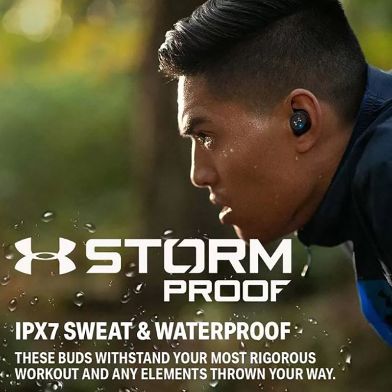 Under Armour Flash دارای گواهی استاندارد IPX7 است به شما این تضمین را می دهد که این محصول دربرار آب و پاشش آب تا حدودی مقاوم است و با توجه به این گواهی شما میتوانید بدون نگرانی به ورزش کردن خود بپردازید. در طراحی هندزفری JBL Under Armour Flash از میکروفونهای قدرتمند و شفاف استفاده شده است تا در هنگام ورزش کردن، اگر تماسی دریافت کنید، بتوانید بدون نیاز به خارج کردن تلفن همراه از جیبتان، به تماسهای خود پاسخ دهید و از مکالمه شفاف و باکیفیت بهرهمند شوید. Ambient Sound یک قابلیت مخصوص صداهای محیطی است. با روشن کردن این قابلیت میتوانید به صورت همزمان هم صدای موسیقیهای خود را بشنوید و هم از فضاهای خارجی و محیط اطراف خود نیز باخبر شوید.