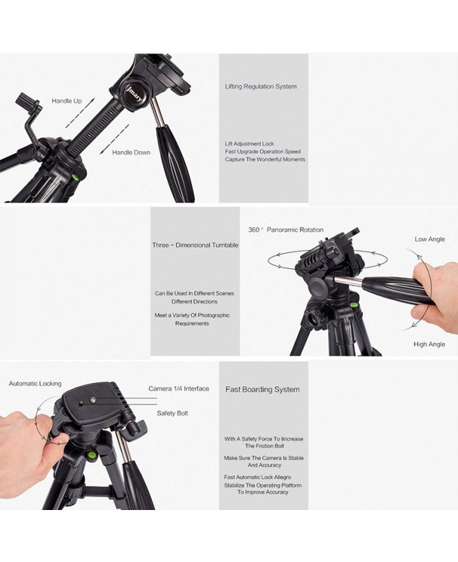 سه پایه دوربین جی ماری مدل KP-2264 ساخته شده از جنس آلومینیوم با کیفیت بوده که حداکثر ارتفاع آن 175.5 سانتی متر می باشد ، و در هنگام عکس برداری می توانید با کمک دسته ایی که بر روی آن تعبیه شده دوربین و زاویای عکاسی را کنترل کنید.
