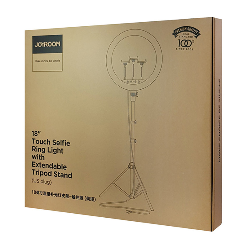 جنس Joyroom 18inch Ring light از آلومینیوم و ABS می باشد که سبب مقاومت بالای این محصول شده است این محصول لامپی با اندازه 45 سانتی متر دارد، ارتفاع سه پایه این محصول از 59 ساتی متر تا 160 ساتی متر می باشد که می تواند تلفن همراه شما را در مکان دلخواه شما و در بازه ارتفاع گفته شده تنظیم کرده و ثابت نگه دارد و براکت این محصول که محل قرار گیری گوشی است از 6 تا 9 سانتی متر تنظیم می شود و همچنین این رینگ لایت یک کنترل را نیز دارا است. نور این محصول ملایم می باشد و مناسب برای از بین بردن سایه است، نور این محصول را می توان به سه حالت گرم، سرد ، و طبیعی تنظیم کرد، میزان دمای رنگ این محصول 2700K-5700K است، لازم به ذکر است که می توانید شدت نور این محصول را نیز به وسیله کنترل رینگ لایت تنظیم کنید.