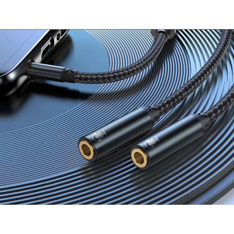مبدل 1 به 2 AUX جوی روم Joyroom Headphone cable SY-A04 قابلیت اتصال همزمان به 2 کاربر را به شما می دهد.طول این کابل 20 سانتی متر می باشد و از الیاف محکم و بادوام بالا ساخته شده است. طبق گفته ی کمپانی جوی روم این کابل از روکش طلا یرخوردار بوده که در کیفیت صدای دریافتی تاثیر بسیار بالایی را دارد.