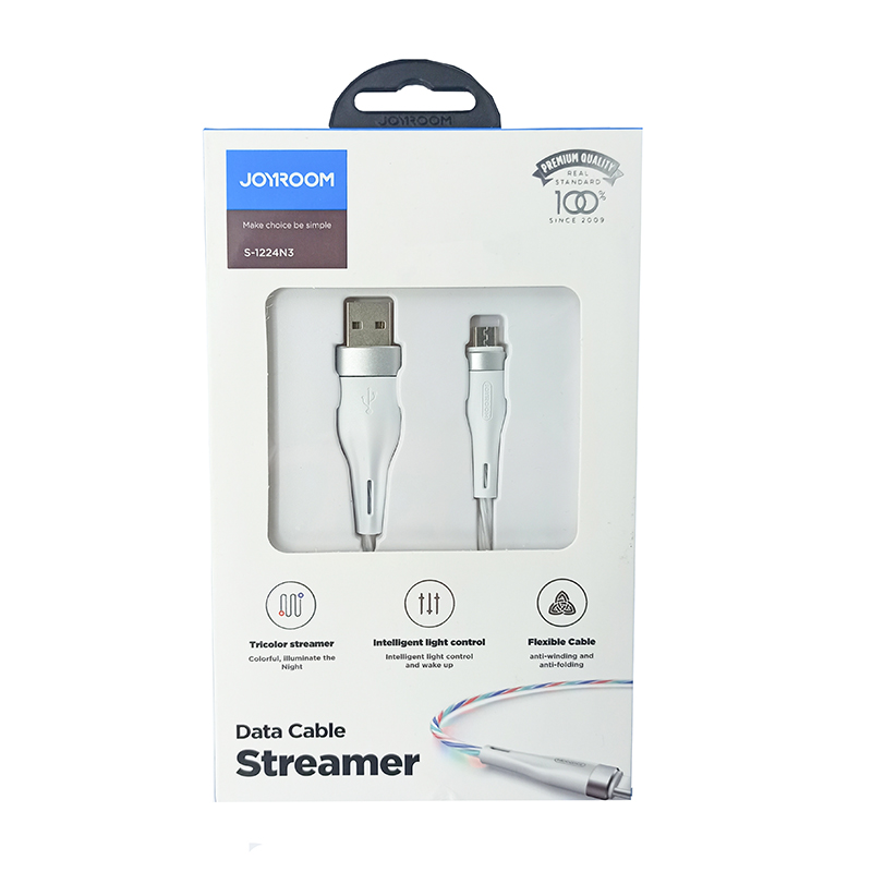 کابل تبدیل Joyroom Data Cable Streamer S-1224n3 محصول برند جوی روم می باشد که کابلی به صورت micro-USB به USB است که هم قابلیت شارژ کردن و هم انتقال داده دارد. این کابل از آلیاژ آلومینیوم و PVC ساخته شده است و طول آن 120 سانتی متر است و کابلی انعطاف پذیر و مقاوم می باشد. این کابل که 33 گرم وزن دارد، 2.4 آمپر حریان را انتقال می دهد، و ویژگی منحصر به فرد این محصول چراغ های رنگی آن است که به هنگام شارژ کردن روشن شده و ظاهر و جلوه زیبایی به این محصول می دهند، البته این چراغ ها ممکن است هنگام شارژ بعضی از دستگاه ها روشن نشوند.
