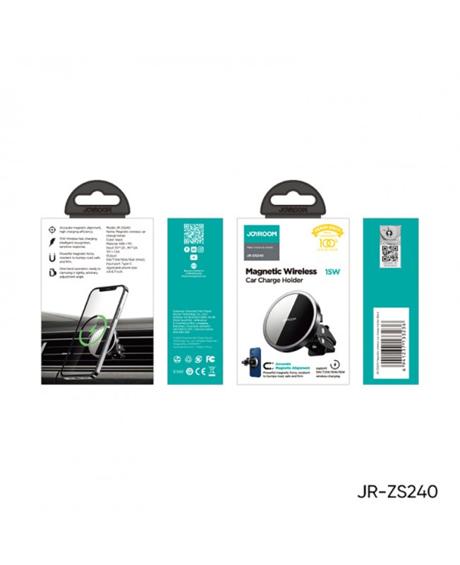 هولدر و شارژر بی سیم خودرو مدل JR-ZS240 مناسب برای آیفون های دارای MagSafe تولید شده توسط کمپانی جوی روم بوده و از کیفیت بالایی برخوردار می باشد.توان خروجی این هولدر 15 وات می باشد.کیفیت ساخت JR-ZS240 بالا بوده و از جنس ABS + PC می باشد. داخل بسته بندی این کالا یک عدد کابل Type-C به USB نیز قرار دارد که باید به فندکی ماشین متصل شود.
