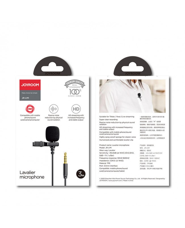 میکروفون یقه ای JR-LM1 برند جوی روم دارای وزن 45 گرمی با طراحی کوچک و از جنس پلاستیک TPE می باشد که این امکان را برای کاربران به وجود می آورد تا بدون هیچ مشکلی از آن استفاده کنند ، به این صورت که میکروفون را مستقیماً از طریق جک 3.5 میلی متری صدا به دستگاه مورد نظر وصل کرده و با کابل 3 متری آن می توانید به ضبط صدا بپردازید. همچنین LM1 یک میکروفون چند منظوره به حساب می آید و می تواند با گوشیهای هوشمند، دوربینهای DSLR و فیلمبرداری و کامپیوتر سازگار شود و با پاسخ فرکانسی در دامنهی 50 تا 1600 هرتز ، حساسیت 3±45- دسیبل و امپدانس 2.2 کیلو اهم به خوبی از پس انجام کار ها بر بیاید. درون بسته بندی این میکروفون نیز یک کیف حمل و دفترچهی راهنما قرار داده شده است.