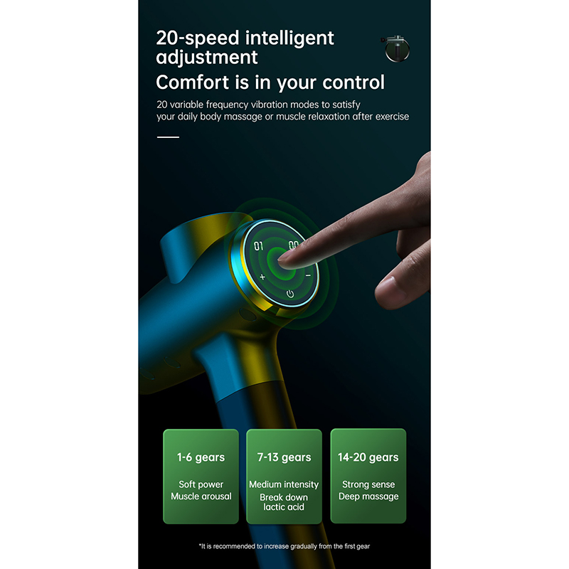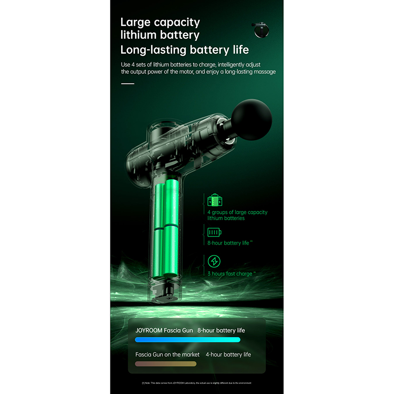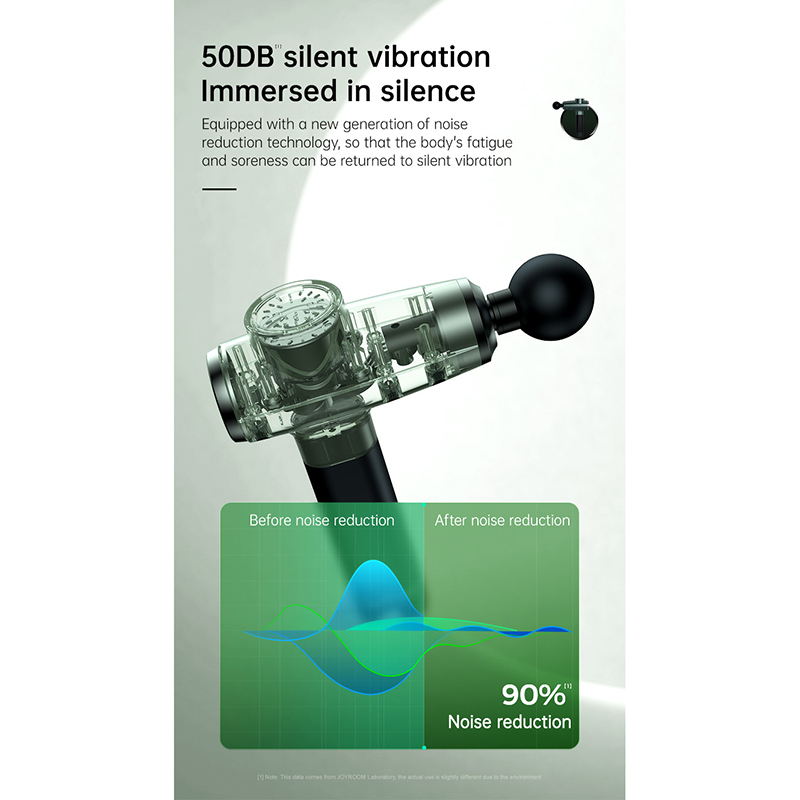 Joyroom Muscle Massager JR-GH102 ماساژوری با جنس بدنه ABS و پلی کربنات با وزن 750 گرم و باتری 2500mAh می باشد ماساژور جوی روم دارای دارای یک صفحه نمایش لمسی می باشد که می توان با استفاده از آن میزان شدت عملکرد موتور و قدرت ماساژ را تنظیم کرد، این محصول 6 سری مختلف دارد که مناسب برای ماساژ دادن نقاط مختلف بدن می باشند و همین طور این محصول دارای سطح بندی های متفاوت برای میزان قدرت موتور ماساژور می باشد. توان موتور این دستگاه 80 وات می باشد، نویز کم این ماساژور 50dB است که باعث می شود که صدای خیلی زیادی نشنوید و باعث ازار شما نمیشود و همین طور قدرت گردش موتور دستگاه 1600تا 3600 دور بر دقیقه می باشد.
