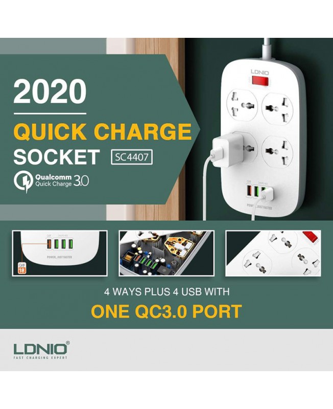 چند راهی برق 2 متری LDNIO با 4 درگاه USB که یکی از آنها دارای قابلیت شارژ سریع (QC 3.0) می باشد و 4 عدد پریز یونیورسال این امکان را برای کاربران ایجاد می کند تا بتوانید به طور همزمان 9 دستگاه خود را به برق متصل کرده و آنها را به طور همزمان شارژ کنند .