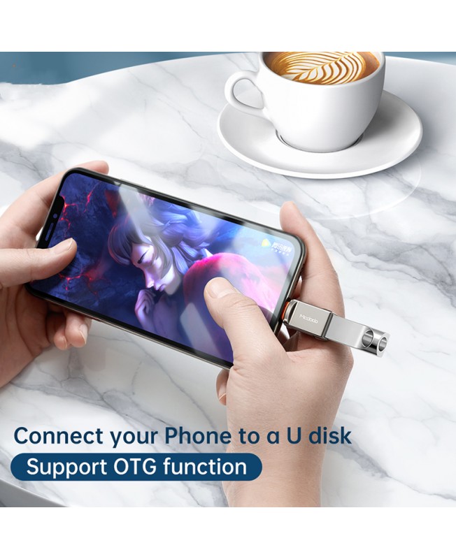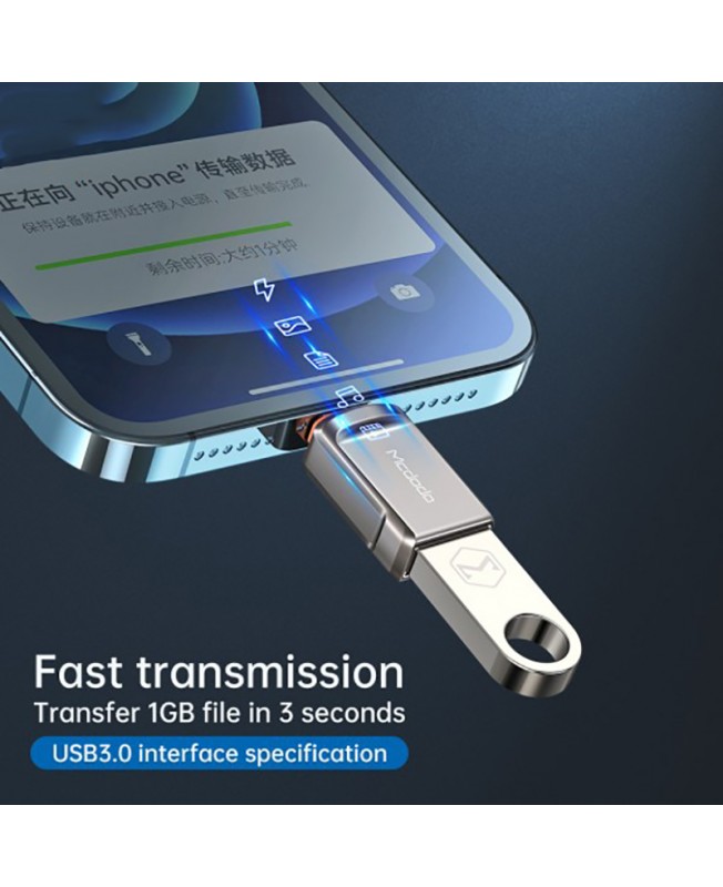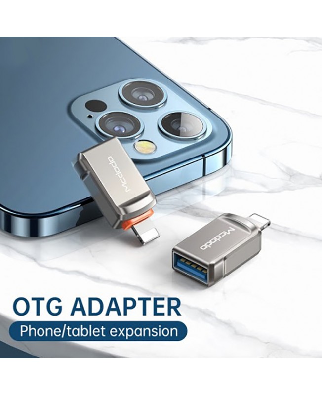 مبدل USB به لایتنینگ یا OTG مک دودو مدل OT-8600 تولید شده توسط کمپانی مک دودو بوده و از کیفیت ساخت بالایی برخوردار می باشد. این مبدل از آلیاژ آلومینیوم ساخته شده و ابعاد آن 26*11*6.8 میلی متر و وزن آن 2.3 می باشد.لازم به ذکر است که با استفاده از این مبدل میتوانید اطلاعات مختلفی مثل عکس و فایل را با سرعت بالا ( USB3.0 )انتقال دهید.