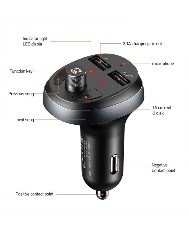شارژر فندکی و پخش کننده اف ام برند مک دودو مدل CC-6880 دارای بدنه ای پلاستیکی با ابعاد 72.9*39.8*47.4 میلی متر با وزن 30 گرم است که دارای دو درگاه خروجی USB-A است. نوع استفاده از اف ام این شارژر فندکی به این صورت است که باید فرکانس ضبط خود را بین 87.5 مگا هرتز تا 108 مگا هرتز قرار دهید و با استفاده از فلش مموری موزیک گوش دهید و یا اینکه بصورت بلوتوثی با موبایل به آن متصل شوید. بیشینه توان خروجی شارژر فندکی Mcdodo نیز 15.5 وات ( 5V/3.1A ) می باشد که قابلیت شارژ سریع را هم دارد. همچنین روی این شارژر فندکی یک نمایشگر وجود دارد که هم ولتاژ باتری و هم فرکانس اف ام را نمایش می دهد. در آخر هم باید گفت که جهت کنترل موزیک می توانید از قسمت چرخشی بالای خود اف ام استفاده نمایید.