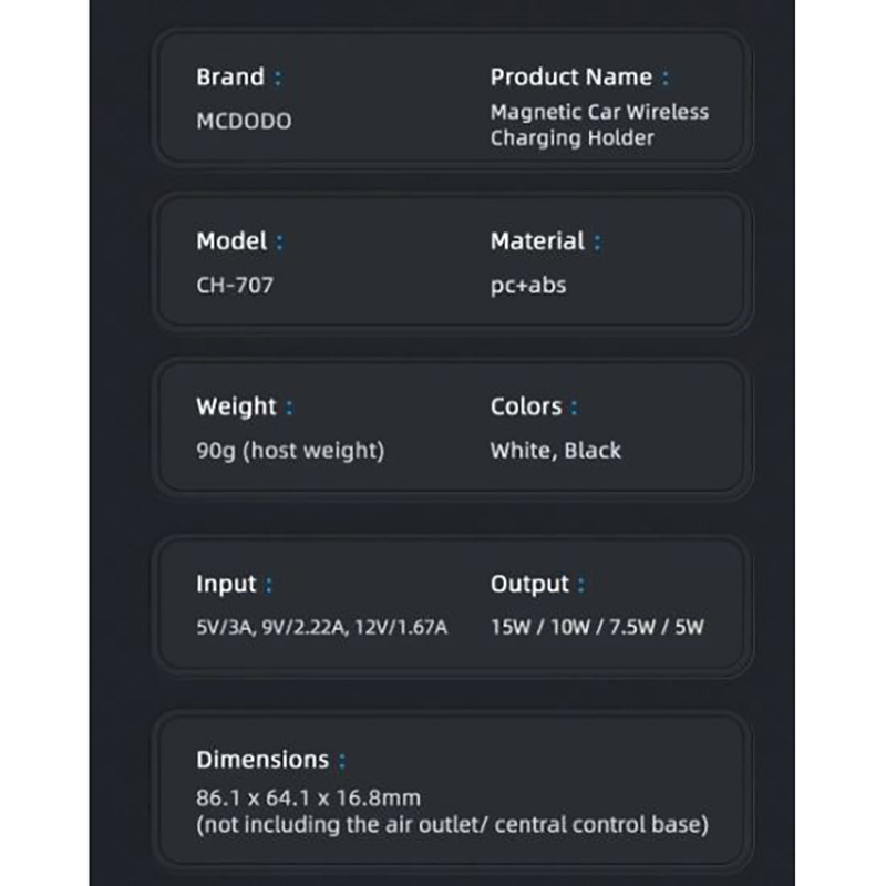 هولدر و شارژر بی سیم خودرو مک دودو Ch-707 از PC و ABS ساخته شده و دارای ابعاد 8.61*6.41*1.68 سانتی متر می باشد و بدنه اصلی آن 90 گرم وزن دارد. این پایه نگهدارنده و شارژر بی سیم برای نگهداشتن آیفون های سری دوازده به بعد که دارای خاصیت مگنتی یا مگ سیف می باشند، مناسب است و به صورت مغناطیسی به آن ها متصل شده و با توان خروجی حداکثری 15 وات گوشی را شارژ می کند، البته لازم به ذکر است که ممکن است به گوشی های دارای قاب های ضخیم متصل نشود و لازم باشد بدون قاب به موبایل وصل شود. از ویژگی های این محصول می توان به شارژ ایمن و قابلیت چرخش 360 درجه اشاره کرد که کار کردن با گوشی در حالت و زاویه مناسب را راحت می کند. این هولدر را می توانید به دریچه کولر وصل کنید و همین طور با استفاده از پایه درون جعبه این محصول که دارای چسب است آن را بر روی هرجایی از داشبورد نصب کرده تا هولدر در آن جا ثابت بماند البته بهتر است که قبل از چسباندن از تمیز بودن سطح مطمعن شده و همچنین بعد از چسباندن دیگر پایه را از سطح داشبورد جدا نکنید. هنگامی استفاده از این هولدر متوجه قدرت مغناطیسی آن خواهید شد و گوشی به راحتی به آن وصل می شود. این محصول حاوی یک کابل USB - Type-C برای شارژ هولدر نیز می باشد.
