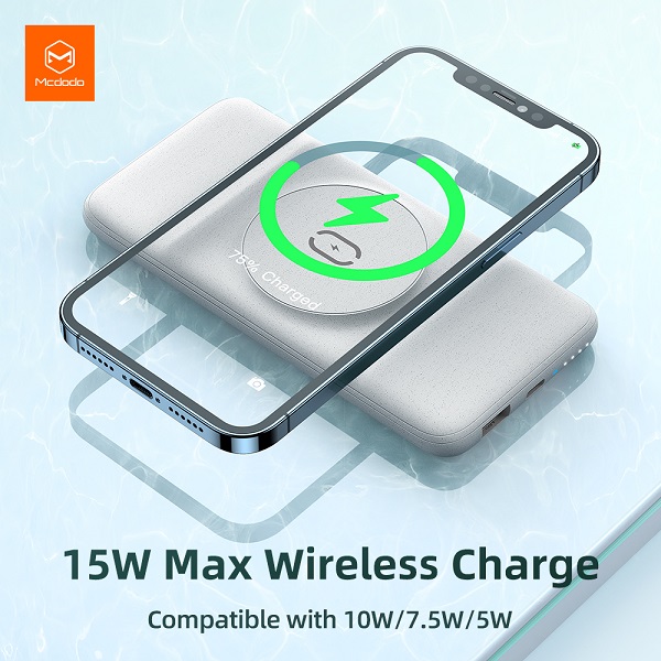 اگر نیاز به پاور بانکی دارید که نه تنها به شارژ سریع دستگاه های شما از طریق کابل بپردازد، بلکه به صورت بی سیم نیز دستگاه های دارای این قابلیت را شارژ کند مک دودو نیاز شما را برطرف کرده است. پاوربانک MC-877 دارای ظرفیت باتری اسمی 10000 میلی آمپر ساعتی است و دارای دو درگاه خروجی بوده که یکی USB-C است که دارای قابلیت PD با توان حداکثری 20 وات وشدت جریان و ولتاژ خروجی 5V/3A, 9V/2.22A, 12V/1.5A می باشد و دیگری USB-A با شدت جریان و ولتاژ خروجی 5V/2.4A, 9V/2A, 12V/1.5A, 5V/4.5A است همین طور به صورت وایرلس نیز توان های خروجی 15W/10W/7.5W/5W را ارائه می کند که البته لازم به ذکر است که قابلیت پشتیبانی از مگ سیف نیز دارد که می تواند به صورت مگنتی یا آهنربایی به آیفون های 12 به بعد که دارای این ویژگی اند متصل شود و به شارژ بدون سیم آن ها بپردازد. درگاه USB-C این شارژر همراه درگاهیی ورودی نیز می باشد که مناسب برای شارژ کردن خود پاور بانک است و ولتاژ و شدت جریان آن 5V/2.4A , 9V/2A می باشد.