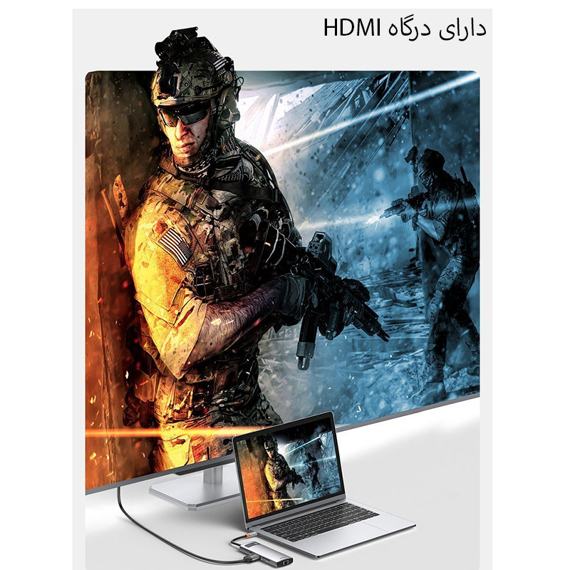 این هاب دارای 8 درگاه مختلف به همراه یک کابل تایپ سی متصل به خود می باشد که می تواند نیاز کاربران را به داشتن درگاه های متنوع برطرف کند، درباره مشخصات پورت های این هاب هم باید بگوییم که درگاه USB 3.0 (سه ورودی) آن از حداکثر سرعت انتقال داده 5Gbps ( با توانایی اتصال به USB2.0 و USB1.1 )، درگاه HDMI آن از کیفیت 4K با فرکانس 30Hz پشتیبانی، درگاه Type-C آن از ویژگی PD با حداکثر توان خروجی 100 وات (این درگاه از ولتاژ های 5V/9V/14.5V/20V و حداکثر جریان 5A) ، درگاه TF card و SD card آن از سرعت انتقال داده 60MB/s و درگاه RJ45 یا همان LAN آن از سرعت های 10Mbps, 100Mbps, 1000Mbps پشتیبانی می کند.