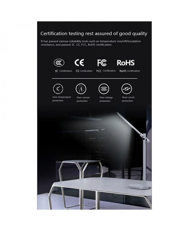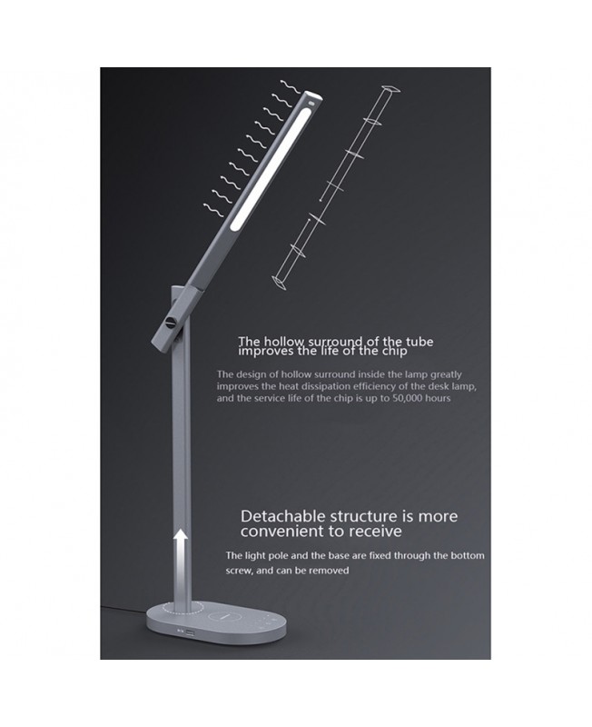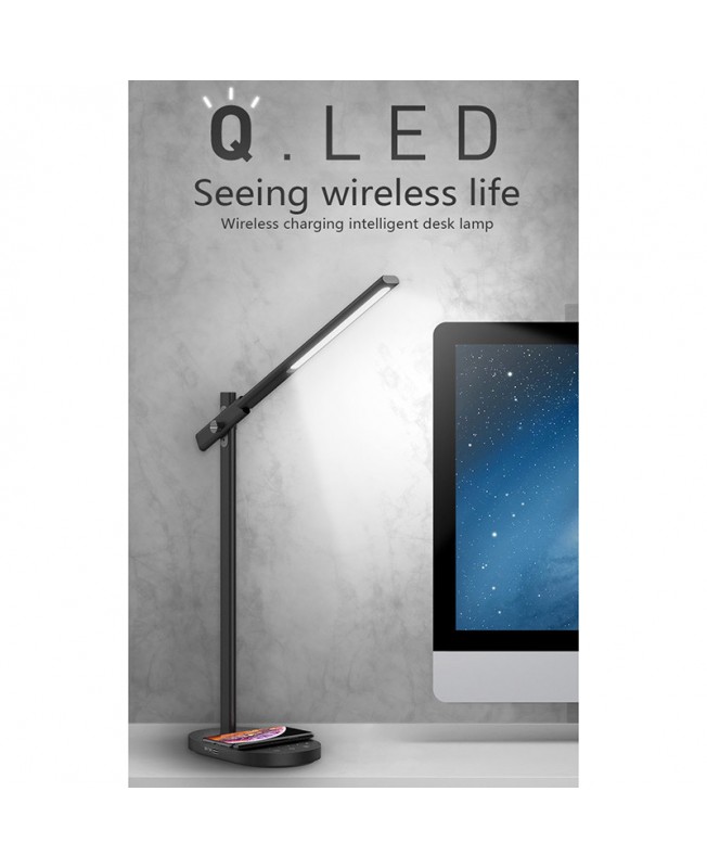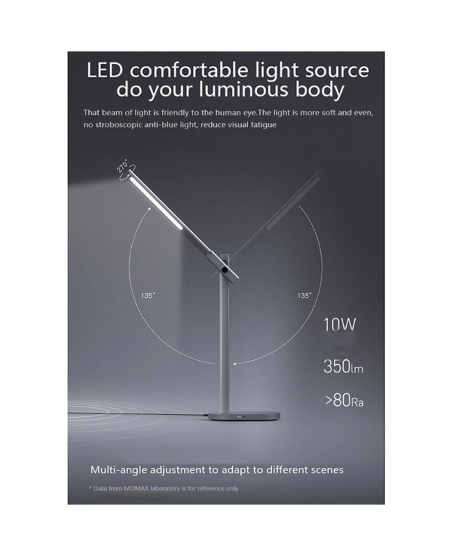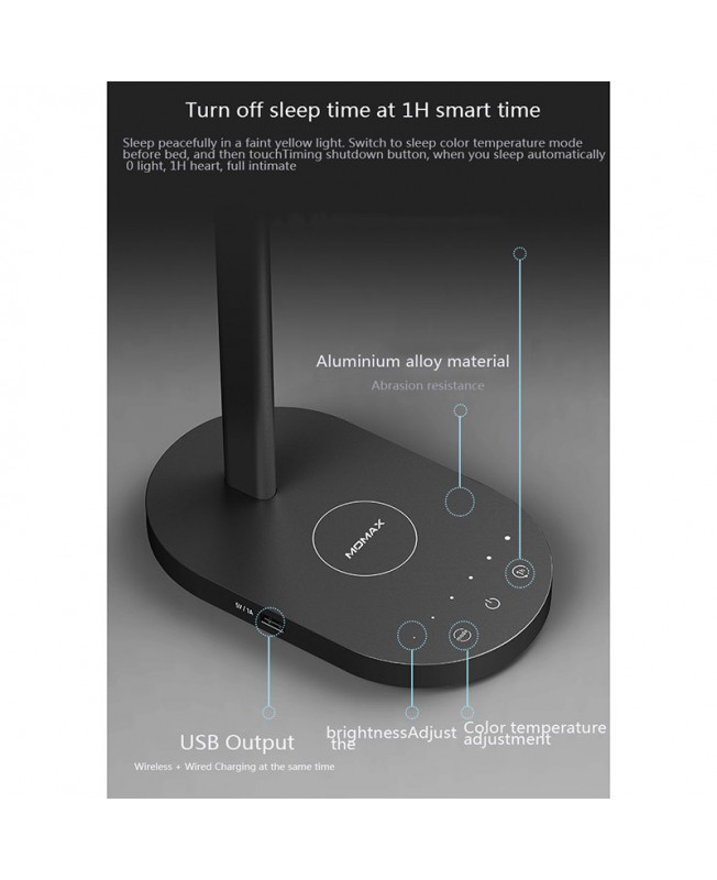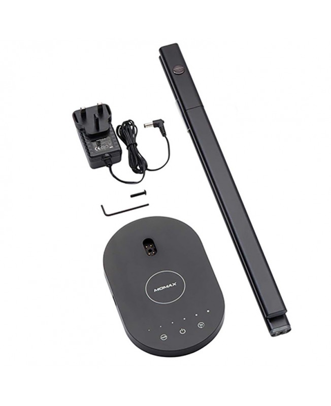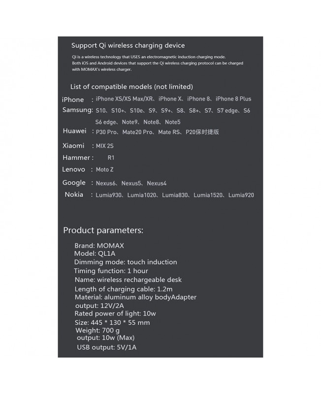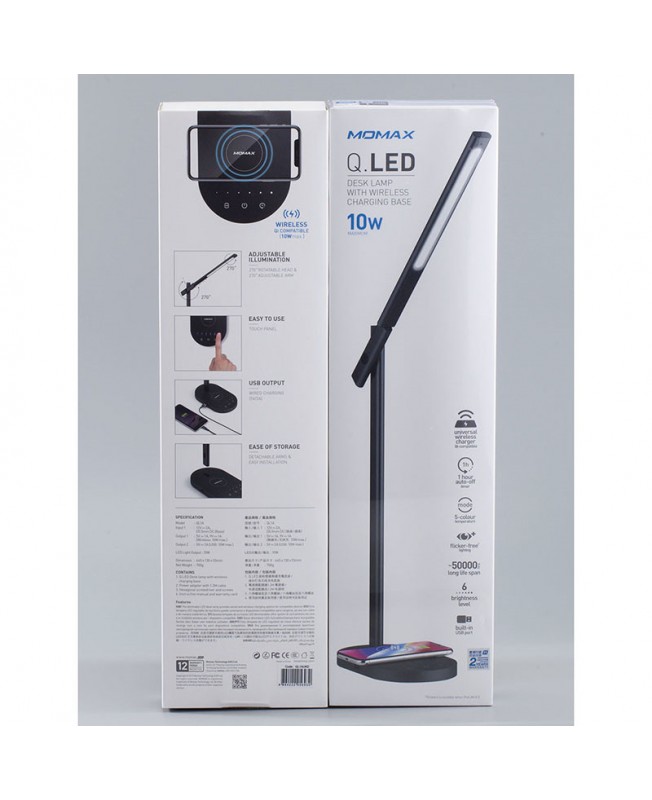 چراغ مطالعه و شارژر وایرلس QL1A برند مومکس با ابعاد 55*130*445 میلی متر و وزن 700 گرم به صورت رو میزی و از جنس فلز طراحی شده به این صورت که شما می توانید پایه آن را بر روی یک سطح صاف یا میز قرار دهید و با کمک بازوی تاشونده آن که توانایی چرخش 270 درجه را دارد از چراغ آن استفاده نمایید.همچنین درباره چراغ MOMAX Desk Lamp With Wireless Charging Base نیز می توان گفت که دارای قابلیت تنطیم نور در 6 سطح روشنایی با 5 طیف رنگی متقاوت در محدوده دمایی 2800 تا 6500 کلوین است و علاوه بر این ها گردنی چراغ هم توانایی چرخش 270 درجه را داراست و می توانید آن را در زاویه دلخواه تنظیم کنید.
