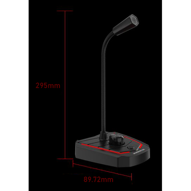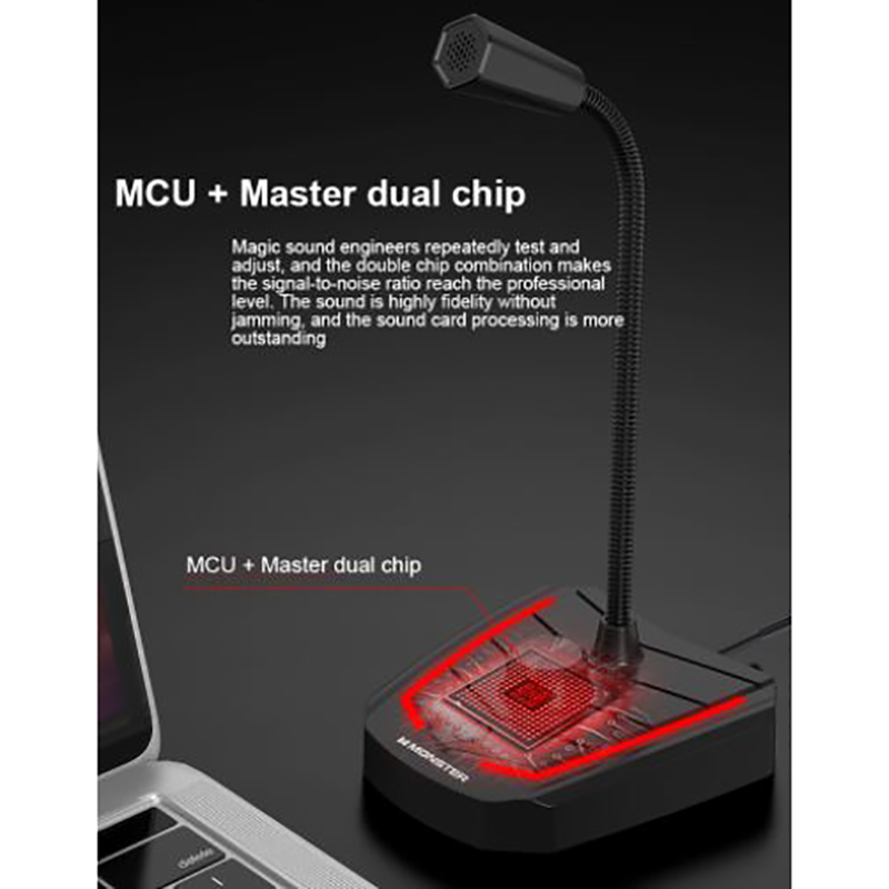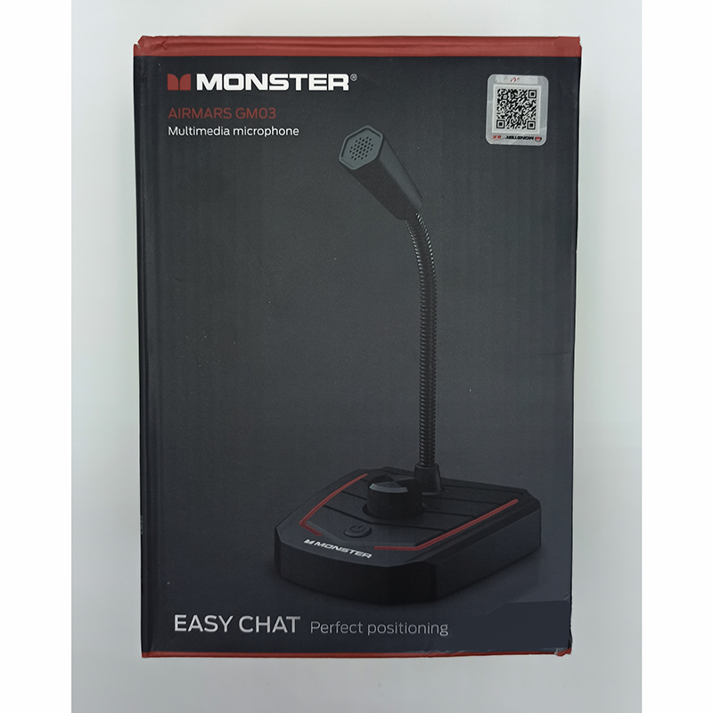میکروفون GM03 ساخته شده توسط برند مانستر می باشد و  ابعاد آن  295* 89.72 *20میلی متر است و دارای الگوریتم قطبی Omnidirectional است، همچنین از ویژگی های صوتی این میکروفون بازی می توان از بازه فرکانسی 100 هرتز تا 10 کیلو هرتز و حساسیت 33dB+/-2dB- نام برد که در کنار پایه مقاوم  مخصوص روی میز، این محصول می تواند به بهترین شکل و به صورت طبیعی صدا را ضبط کند. در آخر هم باید گفت که کابلی وصل شده به این میکروفون وجود دارد که جهت اتصال به درگاه USB لپ تاپ می باشد و منبع تغذیه هم از همین کابل تامین می شود این محصول همین طور دارای درگاه AUX (3.5mm) برای اتصال به گوشی یا هدفون است.
