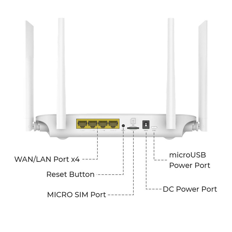 این محصول داری درگاه USB-A برای شارژ، یک شیار سیم کارت میکرو ، کلید ریست و روشن/خاموش و یک درگاه دوگانه LAN/WAN می باشد.