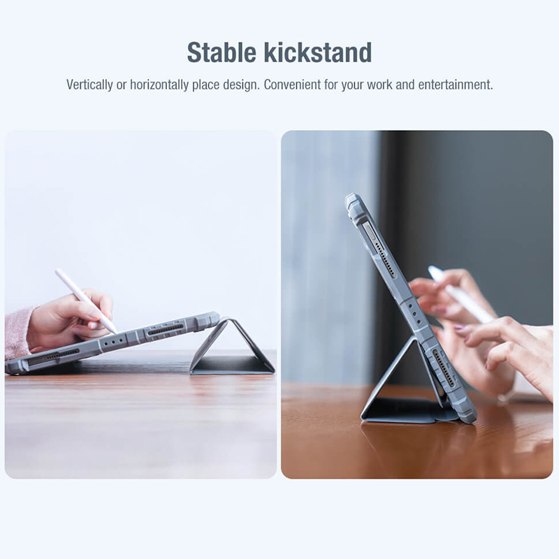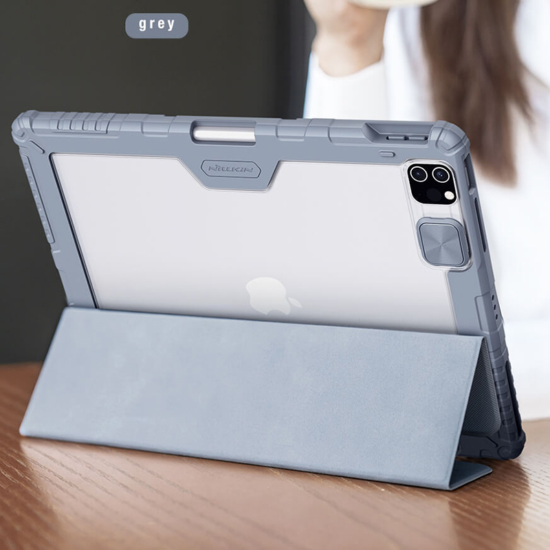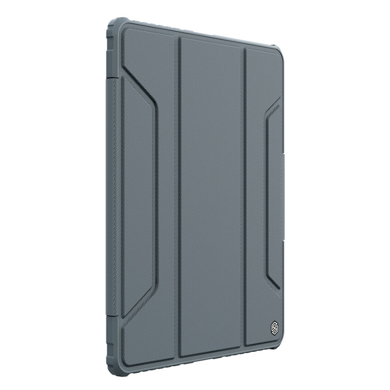 کیف تبلت Bumper Leather Case Pro که توسط نیلکین ساخته شده مخصوص آیپد های Apple iPad Pro 12.9 (2021), iPad Pro 12.9 (2020) می باشد. جنس این محصول که به آن مقامت بالایی داده از TPUو PC ، PU است، این کیف تبلت دارای قابلیت استند است که برای مواقعی مثل کار کردن و یا تماشای فیلم بسیار کار آمد است زیرا به راحتی می توان آیپد را در جایی ثابت گذاشت و صفحه تصویر را به خوبی مشاهده کرد. این کیف کلاسوری محافظی سه بعدی است و کل تبلت راپوشش می دهد برای همین علاوه بر بدنه از قسمت بالایی و پایینی تبلت نیز محافظ کرده و همچنین دارای محافظ لنزی کشویی برای جلوگیری از آسیب به لنز دوربین می باشد. این کیف آیپد دارای برش هایی مناسب برای استفاده از درگاه های دستگاه می باشد و همین طور جای مخصوصی برای نگهداری خودکار مخصوص تبلت اپل را دارد، از دیگر ویژگی های آن می توان به این اشاره کرد که زمانی که درب کیف را باز کرده صفحه تبلت روشن شده و زمانی که آن بسته شود صفجه خاموش می شود.