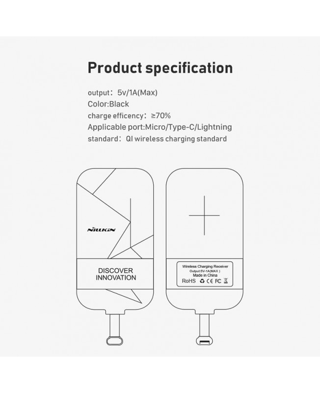 این گیرنده که توسط کمپانی نیلکین تولید شده است که دارای اندازه 80 در 115 میلی متر است که بیشتر برای استفاده روی تبلت کاردبرد دارد و اگر تبلت شما قابلیت شارژ بی سیم ندارد شما می توانید با خرید این محصول این ویژگی را به دستگاه خود اضافه نمایید. نحوه کار با این دستگاه بسیار ساده است به گونه ای که کافی است برچسب گیرنده را برداشته و به پشت گوشی موبایل خود بچسبانید و کابل متصل به آن را به درگاه گوشی وصل نمایید. لازم به ذکر است نکته ی بسیار مهمی که در رابطه با این گیرنده وجود دارد ، وزن بسیار کم و ضخامت بسیار کمی است که به خود اختصاص داده است به طوری که ضخامت این گیرنده 1 میلی متر می باشد. این محصول در سایز مختلف Long و Short می باشد که تفاوت آن ها در طول کابل می باشد و باید با توجه به اندازه ی گوشی موبایل خود شارژر بی سیم مناسب را انتخاب نمایید.