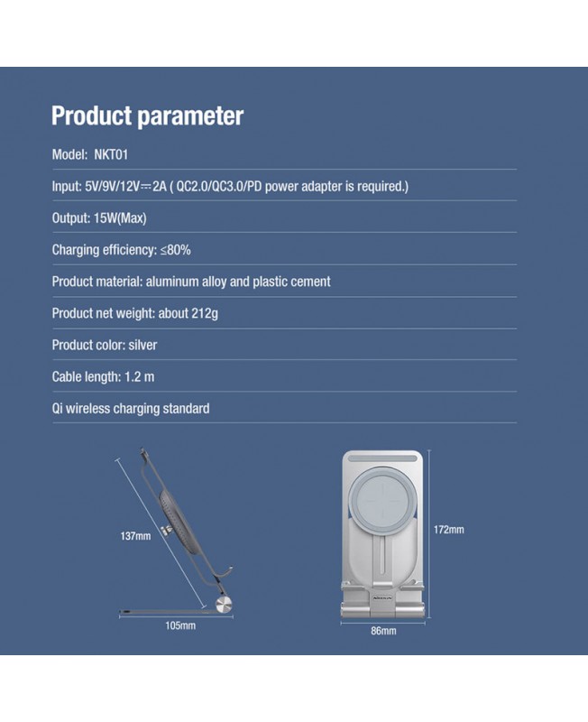 این شارژر بی سیم توسط کمپانی نیلکین تولید شده و بدنه ی آن از جنس آلیاژ آلومینیوم می باشد. یکی از ویژگی های این پایه وایرلس شارژ ، قابلیت تنظیم زاویه آن می باشد که به کمک آن می توانید NKT01 را در زاویه دلخواه تنظیم کنید. توان خروجی نهایی Nillkin PowerHold Wireless Charging Stand برای شارژ بی سیم 15 وات می باشد.