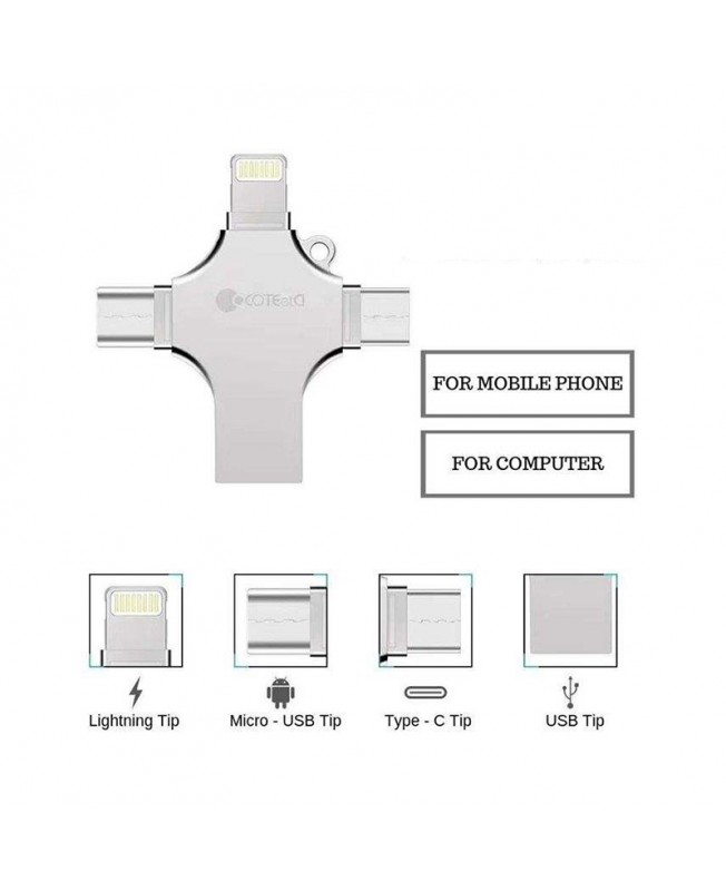 این فلش مموری با ظرفیت 128 گیگابایت از 4 کانکتور USB ، microUSB ، Type-C و لایتنینگ می باشد که مقاوم در برابر آب و شوک الکتریکی می باشد.