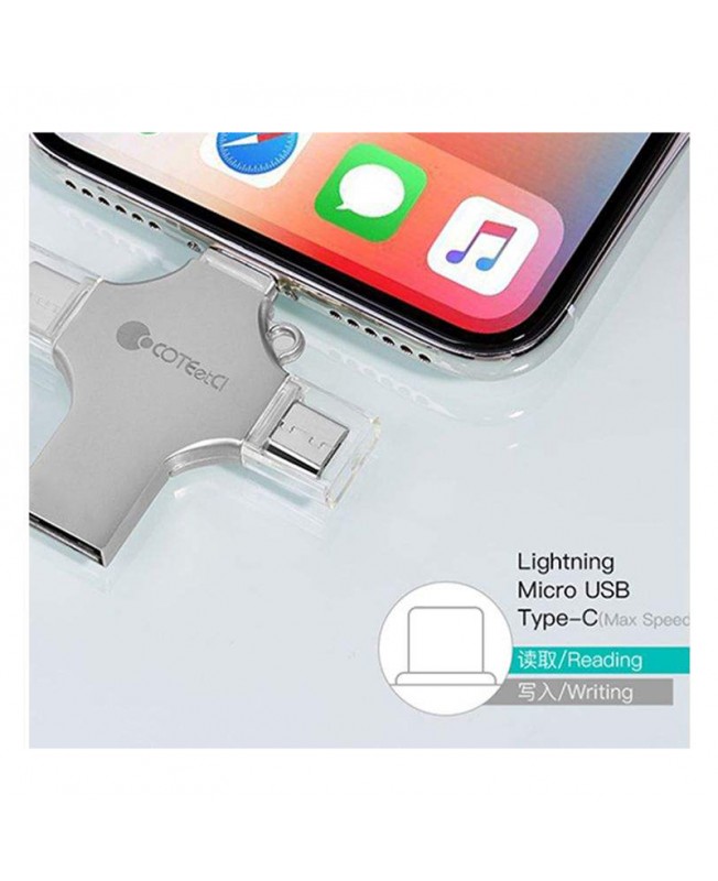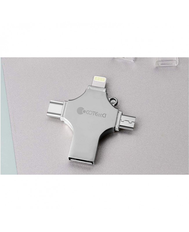 فلش مموری کوتتسی مدل CS8836-32 ظرفیت 32 گیگابایت از 4 کانکتور USB ، microUSB ، Type-C و لایتنینگ می باشد که مقاوم در برابر آب و شوک الکتریکی می باشد.