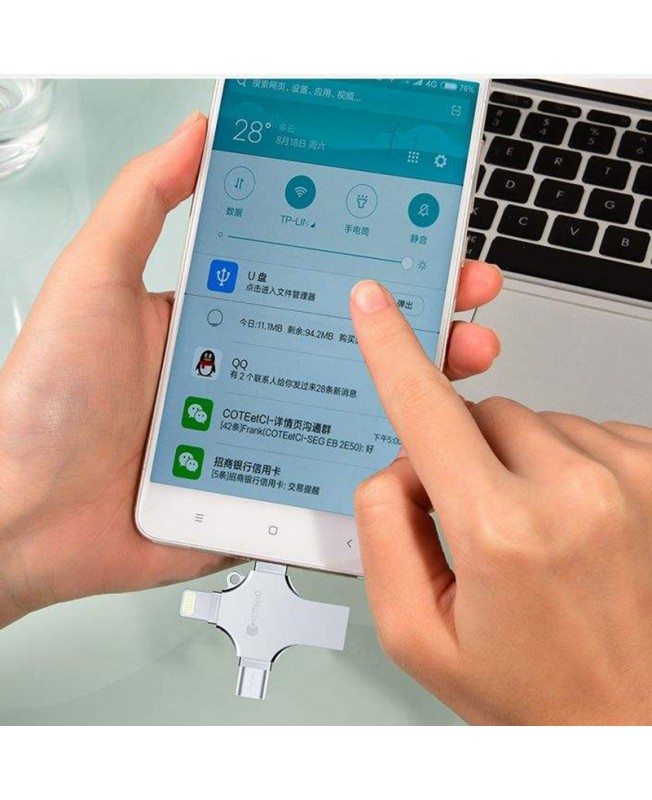 فلش مموری کوتتسی مدل CS8836-64 ظرفیت 64 گیگابایت از 4 کانکتور USB ، microUSB ، Type-C و لایتنینگ می باشد که مقاوم در برابر آب و شوک الکتریکی می باشد.