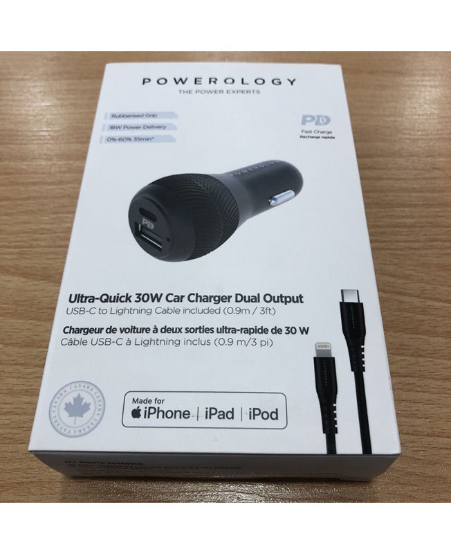 شارژر فندکی PPDCCLBK برند پاورولوژی با مجموع شدت جریان خروجی 2.4 آمپر و ولتاژ خروجی 5 ولت دارای فناوری USB PD می باشد که این امکان را برای کاربران به وجود می آورد تا دستگاه خود را در کمترین زمان ممکن و با امنیت کامل شارژ کنند، شارژر فندکی Ultra-Quick 30W با دو درگاه موجود بر روی خود که یکی از آنها USB و درگاه دیگر Type-c می باشد توانایی شارژ همزمان دو دستگاه را دارد، البته ناگفته نماند که پورت تایپ سی موجود مجهز به شارژ سریع PD می باشد که توانایی حداکثر توان شارژ 18 واتی را برای دستگاهایی که از این ویژگی پشتیبانی می کنند را داراست و به همین دلیل نیز یک کابل 90 سانتی متری تبدیل Type-c به لایتنینگ در بسته بندی این محصول قرار داده شده است که علاوه بر شارژ می توانید برای انتقال اطلاعات نیز از آن استفاده نمایید.و نکته قابل توجه دیگر آن است کهPowerology Ultra-Quick 30W Car Charger دارای مجوز کیفیت کالا MFi از کمپانی اپل می باشد و این بدان معناست که کابل تبدیل USB به لایتنینگ آن از دیدگاه کمپانی اپل برای استفاده روزمره کاملا ایمن و مطمئن است.