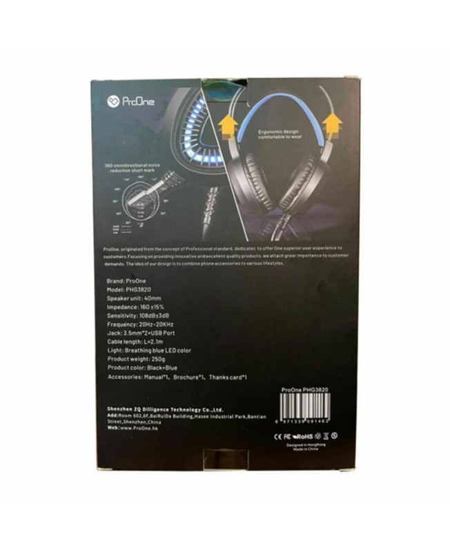 هدفون مخصوص بازی PHG3820 برند ProOne با وزن 250 گرم از جنس پلاستیک با کیفیت و سیلیکون به همراه بالشتک های نرم و به صورت over-ear ساخته شده است تا هنگام استفاده های طولانی مدت توسط کاربران باعث اذیت و خستگی گوش ها نشود ، همچنین برای اتصال به این هدفون سیمی باید از کابل 2.1 متری متصل به آن استفاده کرد که سر آن دارای 3 شاخه مختلف دو عدد AUX (یک سر برای شنیدن صدا و سری دیگر برای انتقال صدای کاربر از میکروفون) و یک USB می باشد و از طریق همین پورت ها می تواند به دستگاه های مختلف متصل شود. درباره طراحی و کانفینگ های این هدفون مخصوص بازی هم باید گفت که قابلیت انجام مکالمه با بهره مندی از میکروفون و تنظیم ارتفاع را داراست که در کنار مشخصاتی نظیر امپدانس 16 اهمی ، بازه فرکانسی 20 هرتز تا 20 کیلو هرتز ، حساسیت 108 دسیبل و با بازه قیمتی خوب می تواند گزینه مناسب جهت خرید و استفاده باشد.