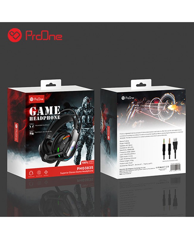 هدفون مخصوص بازی PHG3835 برند ProOne با وزن 323 گرم از جنس پلاستیک با کیفیت و سیلیکون به همراه بالشتک های نرم و به صورت over-ear ساخته شده است تا هنگام استفاده های طولانی مدت توسط کاربران باعث اذیت و خستگی گوش ها نشود ، همچنین برای اتصال به این هدفون سیمی باید از کابل 2.1 متری متصل به آن استفاده کرد که سر آن دارای 3 شاخه مختلف دو عدد AUX (یک سر برای شنیدن صدا و سری دیگر برای انتقال صدای کاربر از میکروفون) و یک USB می باشد و از طریق همین پورت ها می تواند به دستگاه های مختلف متصل شود. درباره طراحی و کامفینگ های این هدفون مخصوص بازی هم باید گفت که قابلیت انجام مکالمه با بهره مندی از میکروفون و تنطیم ارتفاع را داراست که در کنار مشخصاتی نظیر امپدانس 30 اهمی ، بازه فرکانسی 20 هرتز تا 20 کیلو هرتز ، حساسیت 108 دسیبل و با بازه قیمتی خوب می تواند گزینه مناسب جهت خرید و استفاده باشد.