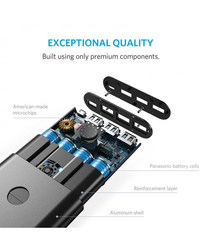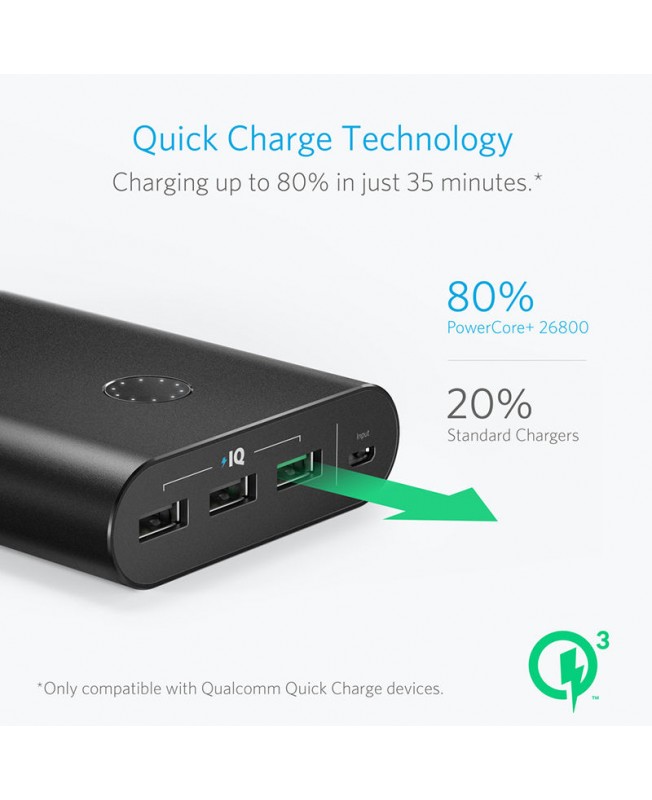 پاوربانک های انکر که جزو بهترین پاوربانک های بازار به حساب می آیند با تنوع های مختلف بسیار محبوب میباشند. پاوربانک 26800 A1374 با 3 خروجی USB امکان شارژ همزمان 3 دستگاه را به شما میدهد. همچنین یکی از پورت های USB آن که رنگ آن نیز متفاوت و سبز رنگ است قابلیت شارژ سریع با تکنولوژی Q3 را دارد. همه پورت های این پاوربانک به وسیله چیپستی که درون پاوربانک تعبیه شده است ، میزان آمپر و ولتاژ مورد نیاز دستگاه شما را تشخیص میدهد و طبق آن دستگاه شما را شارژ میکند. انکر اسم این تکنولوژی را Power IQ گذاشته است. همچنین روی پاوربانک یک دکمه قرارا دارد که دور آن با LED میزان شارژ پاوربانک را نشان میدهد که هر چراغ آن نشاندهنده 10% میزان شارژ پاوربانک است.