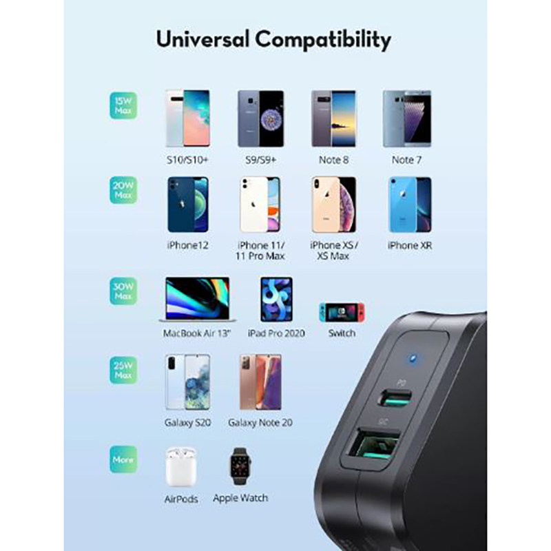 شدت جریان و ولتاژ خروجیUSB-C: 5V/3A ,9V/2A, 9V/2.22A , 9V/2.77A , 15V/2A , USB: 5V/2.4A, 9V/2A , 12V/1.5A