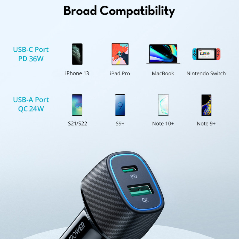 5V-3A / 9V-2A | 30W Max : USB-C Output 5V-2.4A | 18W Max : USB-A Output