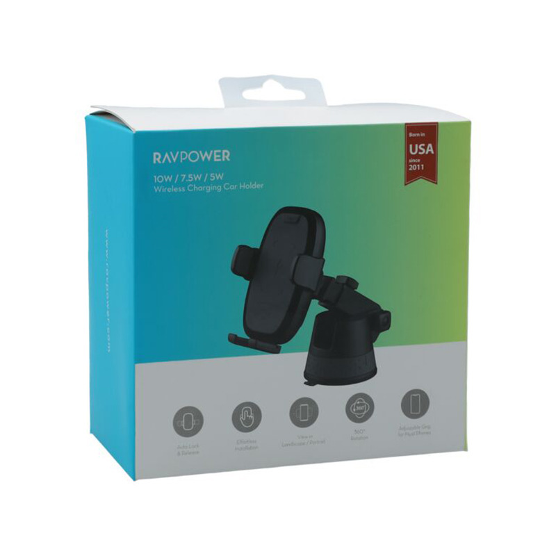 این پایه نگهدارنده از جنس پلاستیک و سیلیکون ساخته شده و برای دستگاه هایی با صفحه نمایش 4.7 تا 6.5 اینچ مناسب می باشد و می توانید به راحتی گوشی تلفن خود را بر روی آن قرار دهید و با کمک بازوهای متحرک و اتوماتیک خود که توسط کلید موجود در قسمت کناری کنترل میشود، بازو ها را بصورت خودکار جمع کنید تا گوشی تلفنتان به خوبی بر روی آن قرار گیرد؛ نحوه اتصال هولدر و شارژر وایرلس موبایل ravpower هم به شکل بادکشی جهت اتصال بر روی داشتبورد می باشد و می تواند این امکان را برای کاربران به وجود می آورد تا به راحتی به درگاهای موجود در انتهای گوشی خود دسترسی داشته باشند. البته قابلیت مهم دیگر این هولدر پشتیبانی از وایرلس شارژ است که برای بهره مندی از این ویژگی باید از کابل Micro-USB موجود در بسته بندی آن استفاده و آن را به فندکی خودرو متصل کرد تا انرژی مورد نیاز جهت شارژ تامین شود، سپس می توان گوشی هایی را که از قابلیت شارژ بی سیم پشتیبانی می کنند بدون هیچ مشکلی بر روی آن قرار داد تا با حداکثر توان خروجی 10 وات شارژ شوند. در آخر هم باید به این نکته توجه داشته باشید که درون بسته بندی این محصول یک کابل میکرو یو اس بی 120 سانتی متری به همراه یک دفترچه راهنما قرار داده شده است.