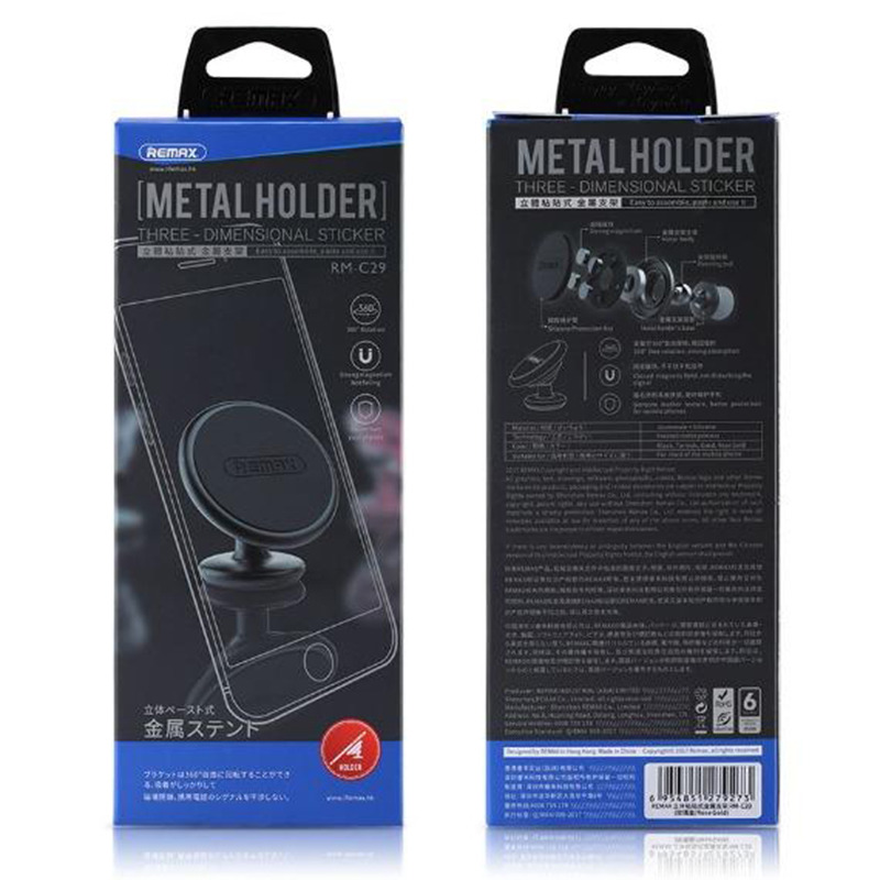 هولدر RM-C29 دارای جنسی از آلیاژ آلومینیوم و سیلیکون می باشد که علاوه بر کیفیت ساخت بالا دارای آهنربای قوی نیز است و با چرخش 360 درجه خود این امکان را برای کاربران فراهم می کند تا بتوانند به راحتی دستگاه خود را بر روی آن قرار دهند ، نحوه کار این پایه نگهدارنده نیز به این صورت است که باید آن را با کمک پایه چسبی خود به داشبورد و یا هر نقطه از خودرو متصل کنید. در بسته بندی پایه نگهدارنده ریمکس یک چسبنده آهنی و دو پلاستیک چسبی برای اتصال به پشت تلفن های همراه و داشبورد قرار داده شده است.