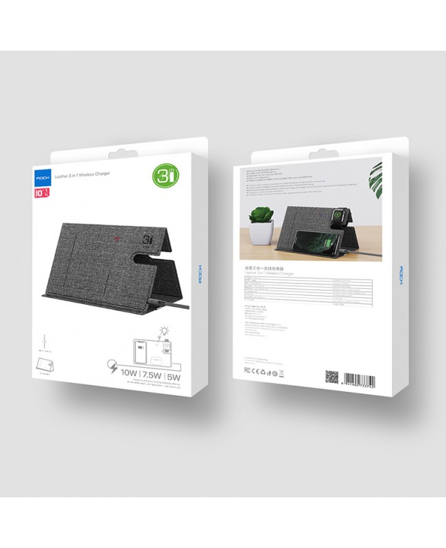 اگر به دنبال شارژر بی سیمی هستید که در حین کارآمدی ظاهر زیبایی را به میز کار و یا فضای خانه شما بدهد ، شارژر بی سیم راک مدل Leather 3 in 1 wireless charger می تواند گزینه مناسبی برای شما باشد. این شارژر وایرلس از PU Leather تشکیل شده و از کیفیت بسیار بالایی یرخوردار می باشد.وزن این محصول Rock 262 گرم بوده و ابعاده آن 435*207*6 می باشد. توان خروجی این شارژر بی سیم برای گوشی موبایل 10 وات ، کیس هندزفری 7.5 وات و برای ساعت هوشمند 5 وات می باشد. طراحی این محصول به گونه ای بوده که به عنوان استند نیز بتوانید از آن استفتده نمایید.