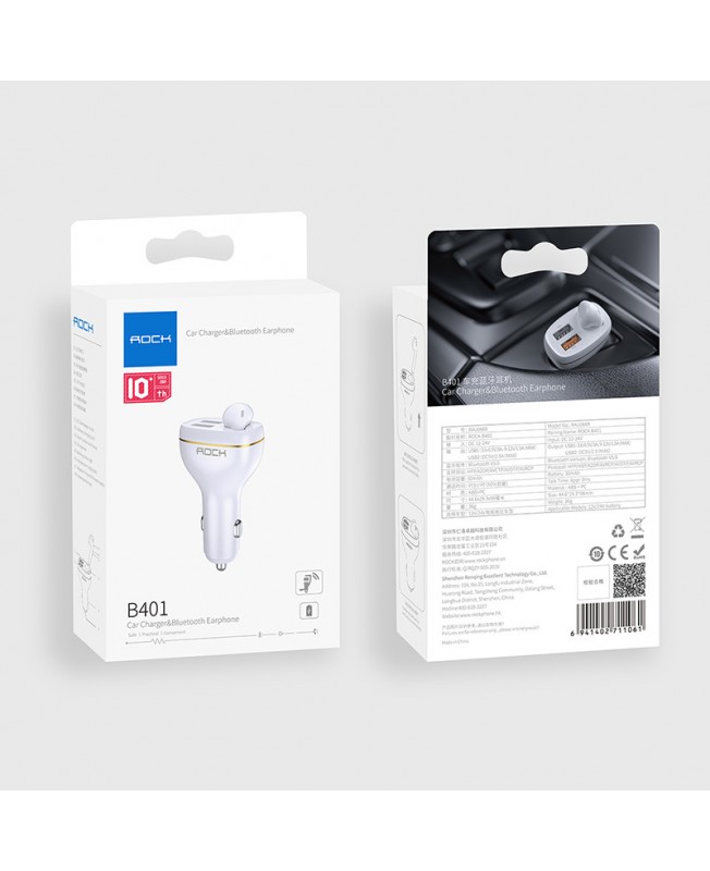 شارژر فندکی راک مدل Rock B401 دارای ابعاد 98*29.3*44.6 میلی متر و وزن 36 گرمی است که یک ایرفون بلوتوثی شبیه به ایرپاد اپل روی آن قرار دارد. وقتی شارژر فندکی راک را جعبه گشایی کنید ، علاوه بر خود شارژر فندکی ، ایرفون تکی بلوتوثی و یک کاتالوگ راهنما نیز درون جعبه قرار دارد. Car Charger & Bluetooth Earphone برند راک دارای دو درگاه خروجی USB-A است که یکی از آن ها خروجی فست شارژ با توان ( 6.5V/3A - 12V/1.5A ) و دیگری ( 5V2/2.5A ) را داراست. راجب ایرفون بلوتوثی آن نیز باید بگوییم که فقط مخصوص گوش راست است و میتوانید از آن برای انجام مکالمات از آن استفاده نمایید. نوع اتصال به ایرفون بلوتوثی راک B401 از طریق بلوتوث با ورژن 5 است که فرقی نمیکند با گوشی های اندرویدی به آن متصل شوید یا اپل. ظرفیت باطری ایرفون بلوتوثی 30 میلی آمپر است که تا 3 ساعت میتوانید با آن موزیک گوش کنید یا به انجام مکالمات خود بپردازید. برای شارژ مجدد آن نیز باید ایرفون را داخل ماژول شارژ روی شارژر فندکی قرار دهید.