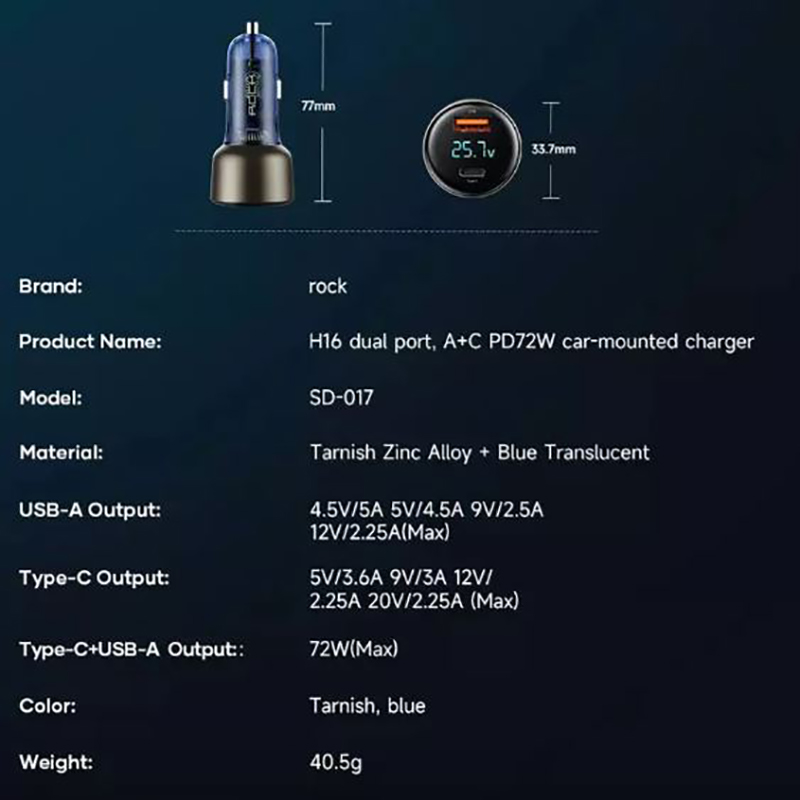 راک یکی از برند های تولید کننده انواع مختلف لوازم جانبی به حساب می آید که توانسته محبوبیت بالایی را در میان افراد به دست آورد. این شرکت این بار با تولید شارژر فندکی که محصولی کاربردی برای شارژ دستگاه های مختلف مانند موبایل به حساب می آید، سعی کرده تا نیاز علاقه مندان به این دسته از محصولات را برآورده کند. شارژر فندکی H16 دارای دو درگاه خروجی USB و USB-C بوده که برای شارژ همزمان دو دستگاه مناسب می باشند و توان خروجی حداکثری آن 72 وات است. این محصول از آلیاژ آلومینیوم ساخته شده و ابعادی 77*33 میلی متری با وزن 40 گرمی داشته و ولتاژ ورودی مناسب برای آن DC 12-24V می باشد. لازم به ذکر است که این شارژر فندکی راک دارای صفحه نمایشی مخصوص بوده که میزان ولتاژ ورودی به شارژر فندکی را نمایش می دهد. در انتها نیز باید گفت که با تهیه کابل شارژ مناسب می توانید از این محصول به بهینه ترین حالت ممکن استفاده کنید.