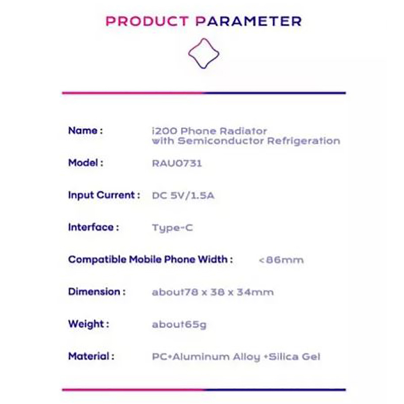 فن خنک کننده گوشی راک مناسب برای انواع گوشی موبایل با سایز 4.7 تا 6.7 اینچ از کیفیت ساخت بالایی برخوردار بوده و با گیره های بازویی خود به پشت گوشی شما متصل می شود .این فن ساخته شده از پلاستیک PC + Aluminium alloy + Silicone بوده و شما می توانید با استفاده از پورت Type-C که روی آن قرار گرفته است و کابل داخل جعبه محصول شارژ کنید.فن های خنک کننده i100 مناسب افرادی بوده که با گوشی موبایل خود کارهای گرافیکی و یا به صورت طولانی مدت بازی می کنند بوده و از مزایای استفاده از آن می توان به جلوگیری از آسیب رسیدن به اجزای سخت افزاری گوشی شما نظیر باتری و جیپست با جلوگیری از داغ شدن گوشی شما اشاره کرد.