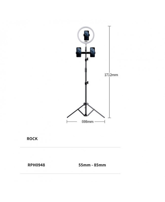 رینگ لایت RPH0948 راک با قطر خارجی 26 سانتی متر و امکان قرار گیری گوشی هایی با سایز 5.5 تا 8.5 اینچ می تواند این امکان را برای کاربران فراهم سازد تا با قرار گیری دستگاه های خود بر روی آن به عکاسی و فیلم برداری بپردازند ، نحوه کار این محصول هم به این صورت می باشد که باید کابل متصل به رینگ لایت را به برق متصل کنید تا انرژی مورد نیاز LED ها تامین شود ، سپس می تواند با استفاده از 4 کلید فیزیکی موجود بر روی کابل روشنایی ، رنگ و روشن/خاموش بودن محصول را کنترل کنید، البته به این نکته نیز توجه داشته باشید یک شاتر بلوتوثی برای کنترل از راه دور به همراه باتری نیز در بسته بندی آن قرار دارد. رینگ لایت پایه دار Rock مجهز به پایه تلسکوپی با قابلیت تنظیم ارتفاع به میزان دلخواه و تنظیم در زوایای مختلف که پایهی آن محکم و ضد لغزش است ، می باشد که می توان آن را تا حداقل ارتفاع 97 سانتی متر و حداکثر ارتفاع 171 سانتی متر مورد استفاده قرار داد.در آخر هم باید گفت که در بسته بندی این محصول علاوه بر پایه و شاتر عکاسی یک گیره قرار گیری نگهدارنده گوشی به همراه یک نگهدارنده نیز قرار دارد و این ویژگی های باعث می شود تا کاربران بتوانند سه دستگاه را به طور همزمان بر روی آن قرار دهند.