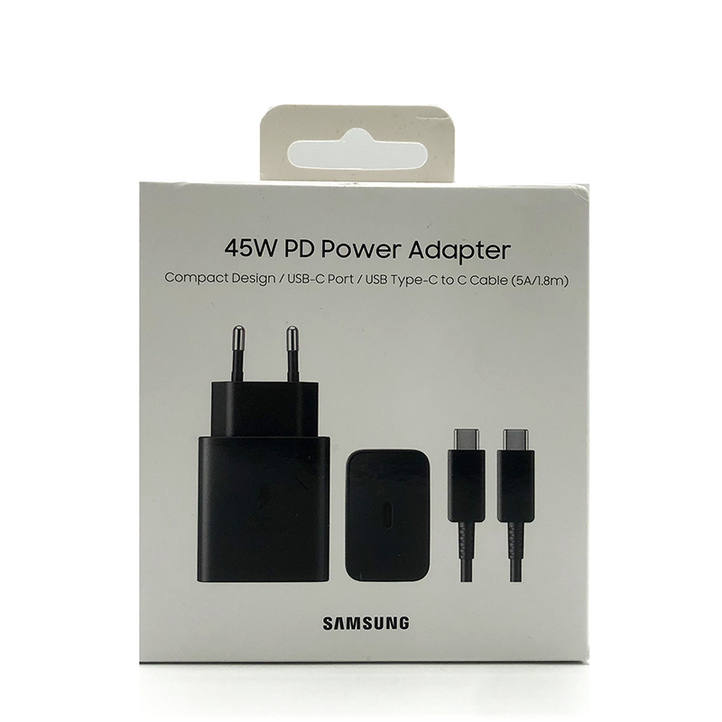 شارژر دیواری سامسونگ به همراه کابل Samsung 45W EP-T4510 | Type-C شارژر اورجینال سامسونگ می باشد. این آداپتور دارای فناوری PD 3.0 است که با استفاده از آن می توانید دستگاه خود را با سرعت بیشتر و با توان 45 وات شارژ کنید. شدت جریان خروجی این شارژر 5 آمپر می باشد که می توان از آن برای شارژ کردن تبلت هم استفاده کنید. برای این شارژر از چیپ هوشمندی استفاده شده تا با اتصال دستگاه به صورت خودکار جریان مناسب را برای دستگاه تامین کند. درگاه خروجی این محصول هم از نوع USB-C است. البته در کنار این شارژر یک کابل تبدیل USB-C به USB-C به طول یک و هشت متر هم ارائه میشود. شارژر EP-T4510 سایر محصولات و موبایل های سری 2019 به بالا و گوشی هایی که توانایی شارژ سوپرفست را دارند پشتیبانی می کند.