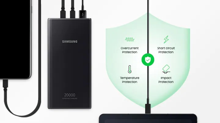 این شارژر همراه برند سامسونگ از 3 درگاه خروجی جهت شارژ بهره می برد و می تواند دستگاهای متصل به خود را با حداکثر توان 25 وات به صورت فست شارژ نماید. همچنین باید توجه داشته باشید که پاوربانک 20000 میلی امپر سامسونگ به دلیل حجم بالا ، توان خروجی و قابلیت PD توانایی شارژ لپ تاپ و تبلت را در کنار بهره مندی از قابلیت های محافطتی کنترل افزایش دما ، جریان و ولتاژ داراست.