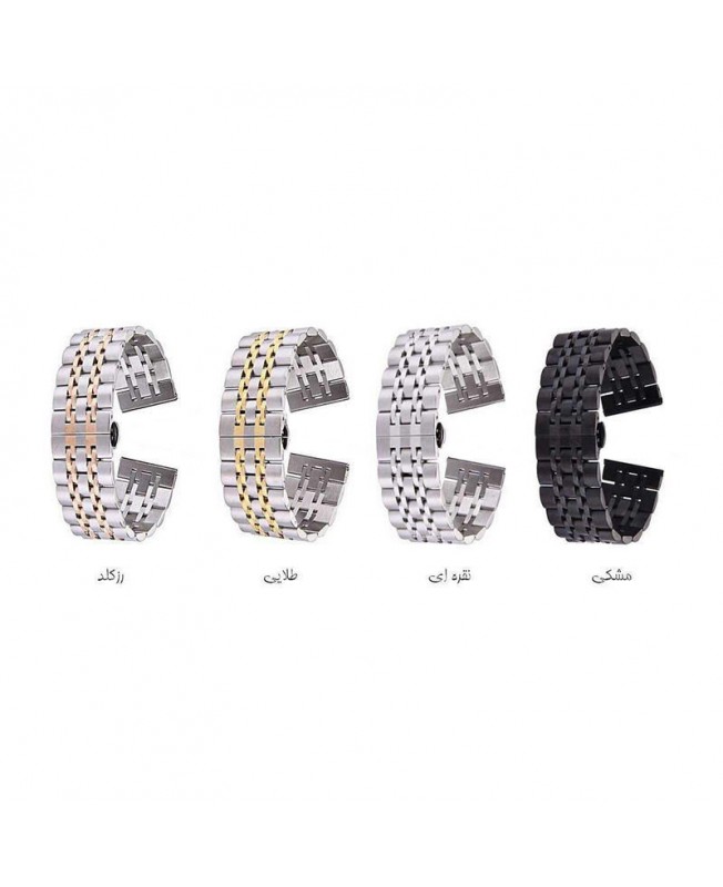 بند فلزی ساعت هوشمند سامسونگ Gear S2 در چهار رنگ تنوع وجود دارد و دارای هفت ردیف بافت فلزی می باشد. اندازه سر بند 20 میلی متر است و نوع قفل آن نیز بصورت قفلی می باشد. نکته ای که راجع به بند فلزی ساعت سامسونگ Gear S2 باید بدانید این است که می توانید به وسیله آچار مخصوص اندازه آن را تغییر دهید و مناسب با اندازه دستتان از آن استفاده نمایید.بند فلزی ساعت سامسونگ Gear S2 در شهر جانبی هیلاتل