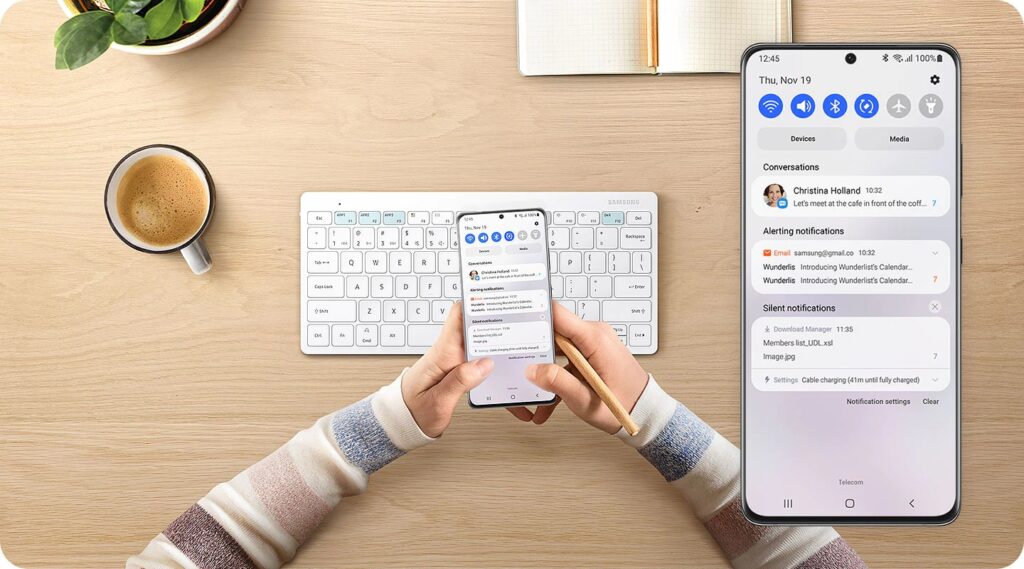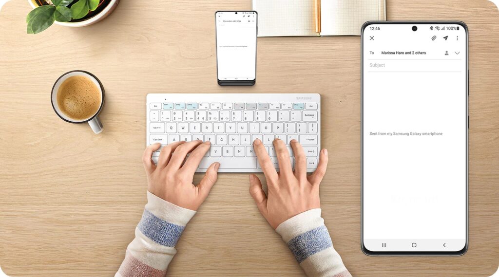 با دسترسی به DeX از طریق صفحه کلید هوشمند Samsung Trio 500، دستیابی به عملکرد و بهره وری مانند دسکتاپ به واقعیتی تبدیل می شود که می توانید از هر کجا آن را نشان دهید. با چندین پنجره به طور همزمان کار کنید، به پیام ها و ایمیل ها به طور موثر در یک صفحه پاسخ دهید و فراتر از مرزهای دستگاه ها دست پیدا کنید.