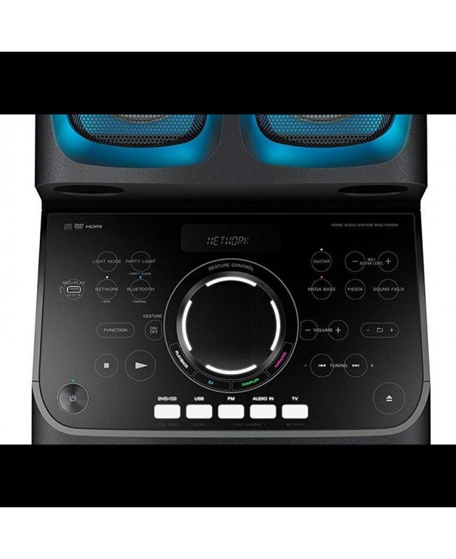 قابلیت MEGA BASS که بر تولید و پخش صدای قدرتمند و کامل کمک خواهد کرد و با استفاده از این قابلیت صدای با تمام باس ها را خواهید شنید. قابلیت پاک سازی صدا CLEARAUDIO+ بر روی سیستم صوتی سونی V90 اجازه نخواهد داد هیچ ناخالصی بر روی صدا قرار بگیرد تا مانع پخش صدا با بالاترین کیفیت شود.و این قابلیت در سری V سونی مشاهده میشود و لا آن دیگر بر روی صدای در حال پخش، اثری از نویز نخواهید بود. سیستم صوتی سونی V90 به امکانات پیشرفته تری نیز مجهز شده است از جمله قابلیت DJ، که شما میتوانید مانند دی جیهای حرفهای صدا را مدیریت کرده و در میان حالت های FLANGER، ISOLATOR، PAN، WAH و SAMPLER تغییر دهید تا به صورت متفاوت صدا و موسیقی پخش شود. قابلیت کاراکوئه که امکان خوانندگی را در مهمانی فراهم میکند و به شکل فیزیکی با قرار گرفتن دو پورت میکروفون بر روی سیستم صوتی سونی V90 قرار میگیرد. و شما میتوانید دو میکروفون را به این سیستم صوتی متصل کنید و به صورت دو نفره خوانندگی کنید. البته این امکان وجود دارد که بر روی یکی از پورتهای میکروفون و بر روی دیگری گیتار را متصل نمایید. و در صورت درخواست شما این قابلیت به شما نمره خواهد داد و به شما کمک خواهد کرد تا در خوانندگی پیشرفت کنید.