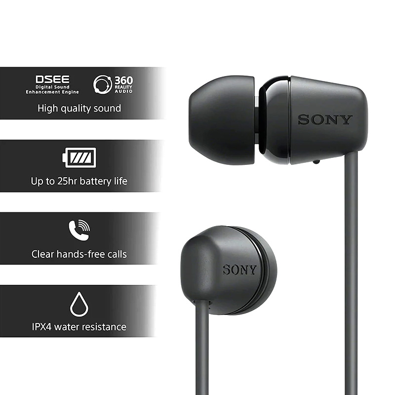 هدفون دور گردنی Sony WI-C100 دارای قسمت کوچکی است که بر روی آن طراحی شده و میکروفون و سه دکمه پاور ,صدای کم و زیاد روی آن قرار دارد. باتری آن نیز در پشت گردن شما قرار میگیرد که وظیفه پخش موسیقی تا 25 ساعت به طور مداوم را به عهده دارد. همراه با این محصول، سرگوشیهایی با سه سایز مختلف وجود دارند. استاندارد ضد رطوبت IPX4 و صدای 360 درجه از دیگر ویژگیهای این هندزفری هستند. در انتها تیز باید بگوییم به لطف درایور های 9 میلی متری بازه فرکانسی که این ایرفون از آن پشتیبانی می کند 20 تا 20000 هرتز می باشد.