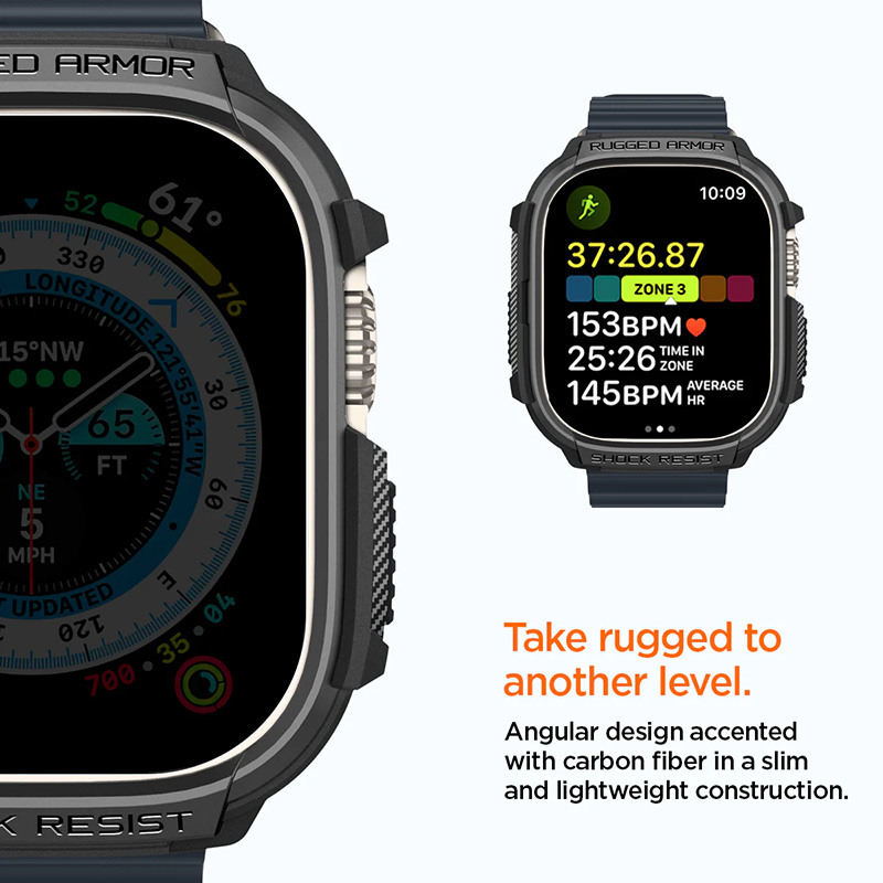 داشتن کاوری محافظ برای ساعت های هوشمند می تواند امری بسیار مهم باشد زیرا از شدت آسیب رسیدن به آن ها در صورت افتاد را کم می کند. به همین منظور برند اسپیگن کاور Rugged Armor را تولید کرده که برای محافظت از اپل واچ سری اولترا مناسب می باشد و دور صفحه نمایش آن را می پوشاند تا در صورت افتادن از آن محافظت کند. جنس این محصول از پلاستیک TPU بوده که استقامت نسبتا مناسبی در برابر ضربه و فشار وارده دارد.البته به این نکته توجه داشته باشید که این حصول تنها قاب محافظ بوده و از صفحه نمایش ساعت هوشمند شما محافظت نمی کند و تنها اطراف و پشت ساعت را پوشش می دهد.