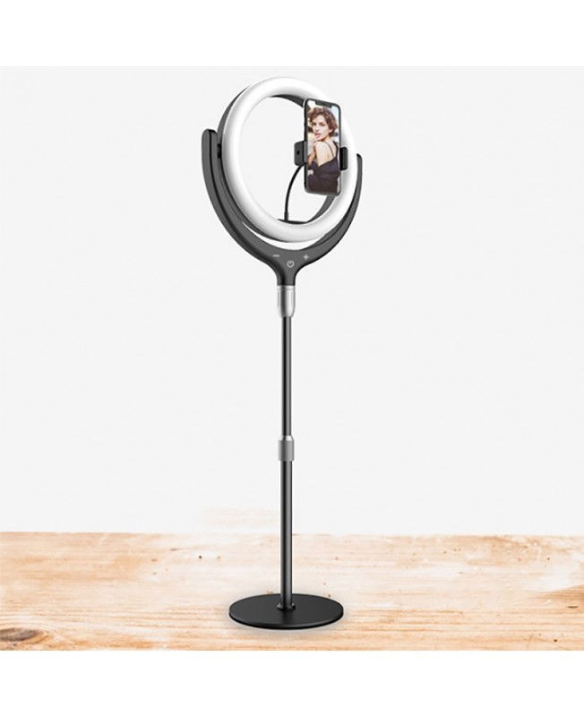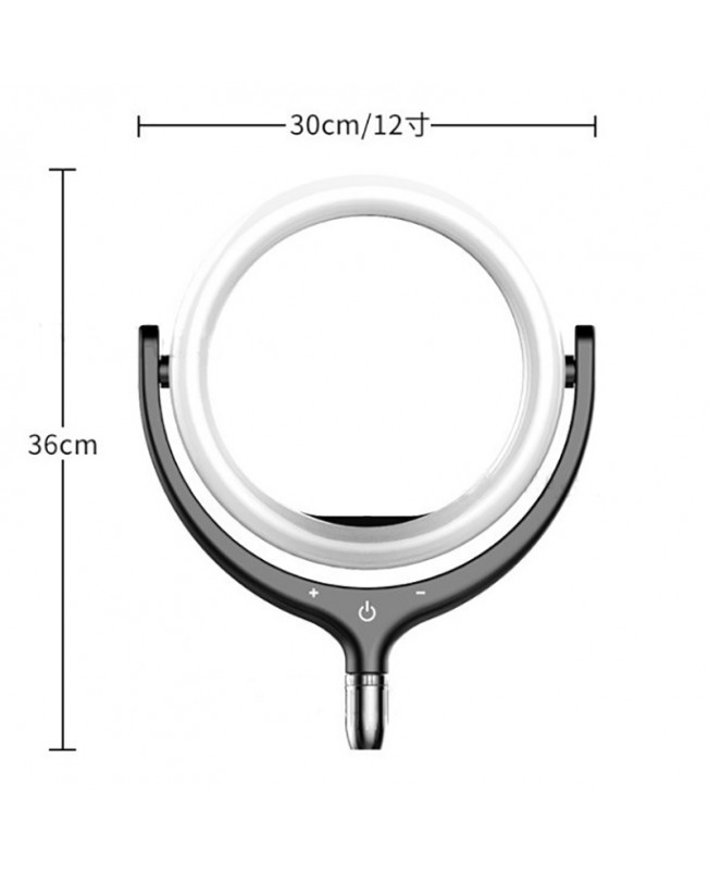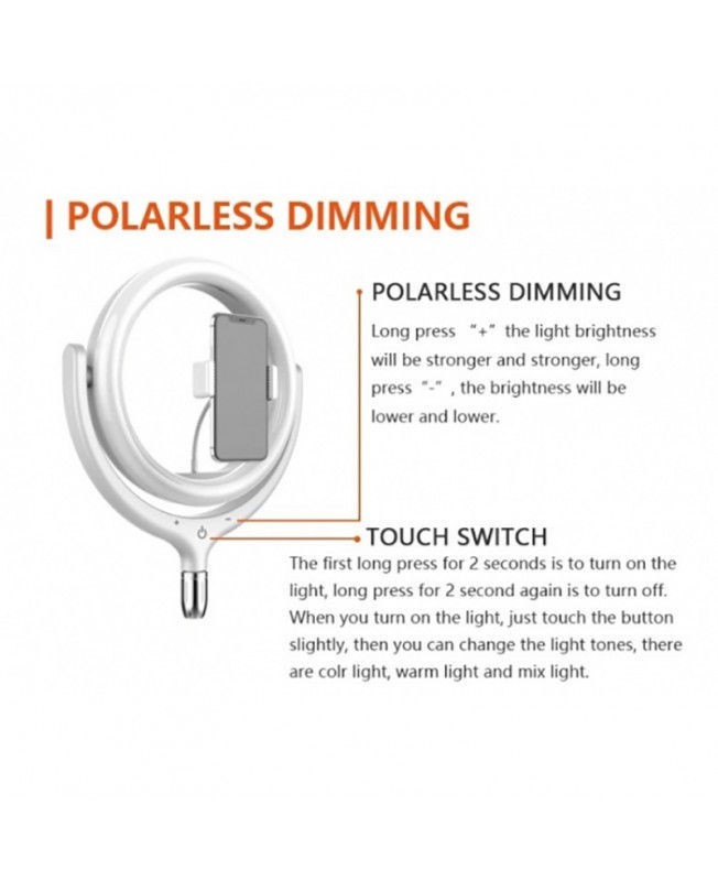 رینگ لایت Totu رو میزی مدل F-539A مناسب برای گوشی موبایل که با نور پردازی حرفه ای شرایط را برای عکسبرداری و فیلم برداری دقیق و روشن مهیا می کند. این رینگ لایت سلفی دارای 96 چراغ LED زیبا است که قدرت روشنایی آن 2800LM میباشد و این چراغ ها قابلیت تنظیم نور در سه حالت سرد، گرم و ترکیبی (Cold,Warm and Mix) را دارند. همچنین توان لامپ های این رینگ لایت 10 وات است. رینگ لایت پایه دار Totu مدل F-539A مجهز به پایه تلسکوپی با قابلیت تنظیم ارتفاع به میزان دلخواه و تنظیم در زاویای مختلف که پایهی آن محکم و ضد لغزش است و با آن میتوانید بدون هیچ گونه لرزشی جهت ثبت تصاویری شفاف و باکیفیت اقدام کنید. این رینگ لایت قابلیت شارژ شدن از طریق USB، جهت تولید نوری ایمن، ضد اشعه ماوراء بنفش، مادون قرمز و گرمای کم را دارد و مجهز به دکمههای لمسی جهت کنترل میزان روشنایی، خاموش/روشن و تغییر رنگ نور است.نحوه استفاده از رینگ لایت گوشی مدل F-539A