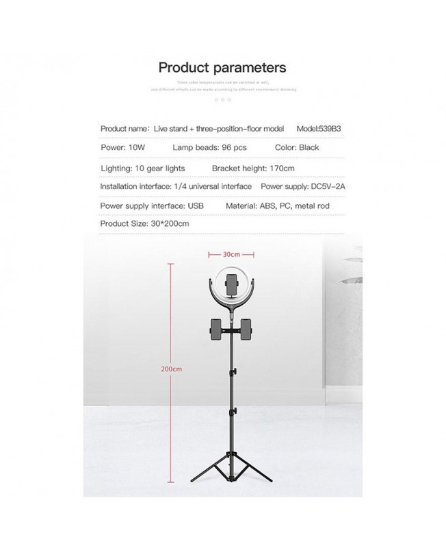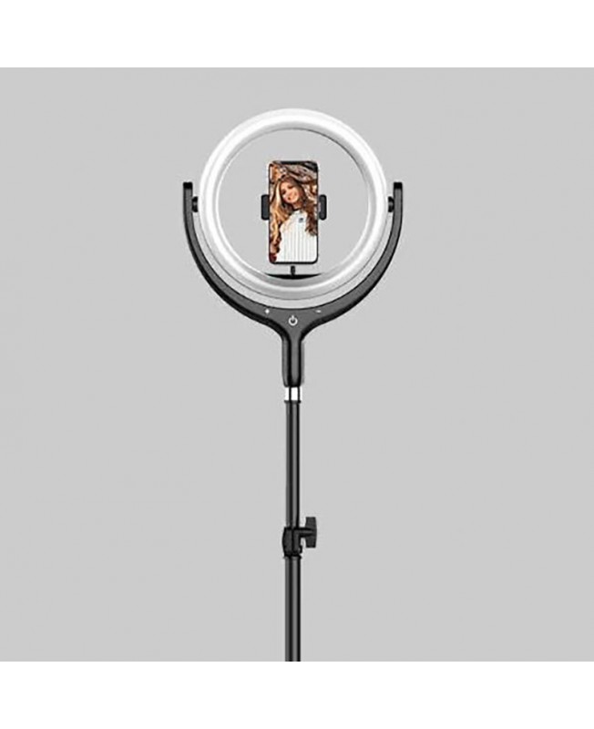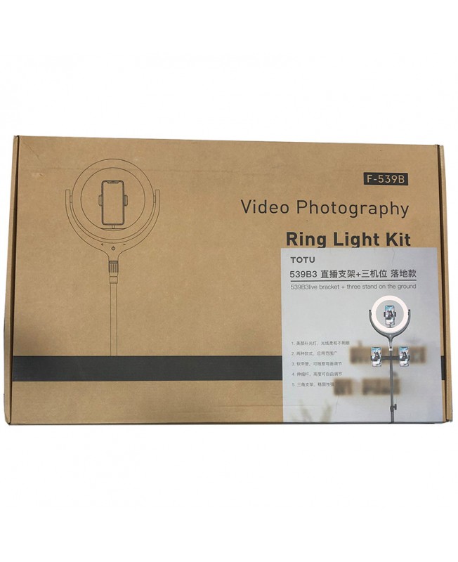 رینگ لایت Totu رو میزی مدل F-539B با سایز 12 اینچ مناسب برای گوشی موبایل که با نور پردازی حرفه ای شرایط را برای عکسبرداری و فیلم برداری دقیق و روشن مهیا می کند. این رینگ لایت سلفی دارای چراغ های LED زیبا با توان 10 وات است که این چراغ ها قابلیت تنظیم نور در سه حالت سرد، گرم و ترکیبی (Cold,Warm and Mix) را دارند. رینگ لایت پایه دار Totu مدل F-539B3 مجهز به پایه تلسکوپی با قابلیت تنظیم ارتفاع به میزان دلخواه (بین 40 تا 70 سانتی متر) و تنظیم در زوایای مختلف که پایهی آن محکم و ضد لغزش است و با آن می توانید بدون هیچ گونه لرزشی جهت ثبت تصاویری شفاف و باکیفیت اقدام کنید و برای تامین انرژی مورد نیاز ان هم می توانید کابل USB آن را به برق متصل کنید ، همچنین برای کنترل محصول نیز شرکت توتو کلید های فیزیکی بر روی دایره رینگ لایت آن قرار داده است.در آخر هم باید به این موضوع توجه داشته باشید که علاوه بر نگهدارنده ای که در مرکز رینگ لات نصب می شود دو نگهدارنده گوشی دیگر به همراه یک گیره برای قرار گیری بر روی پایه نگهدارنده در بسته بندی این محصول وجود دارد.